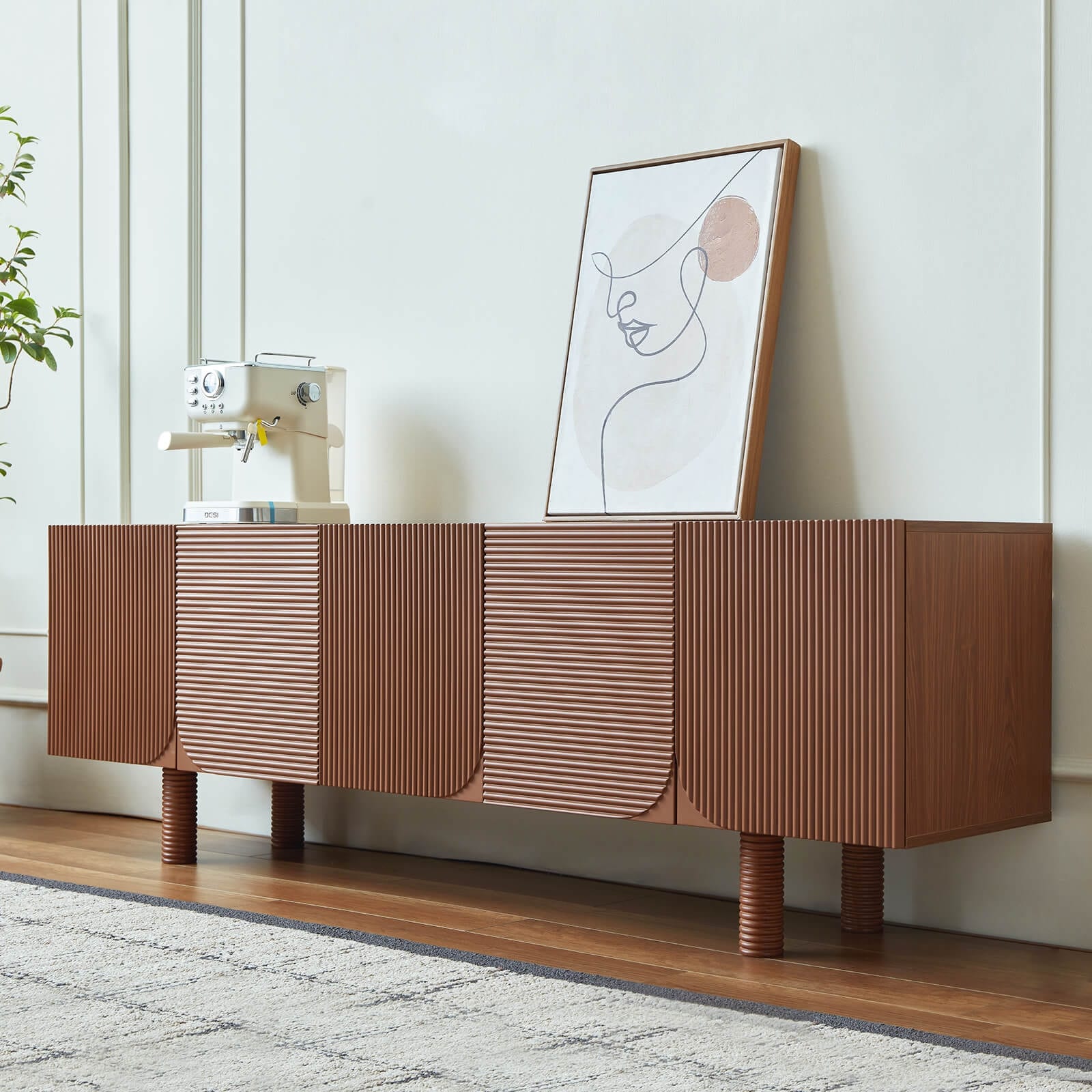 Mid-Century Modern TV Stand for 80 Inch TV, 70.9” Walnut Textured TV Media Console with Fluted Doors & 4 Storage Cabinets-Walnut