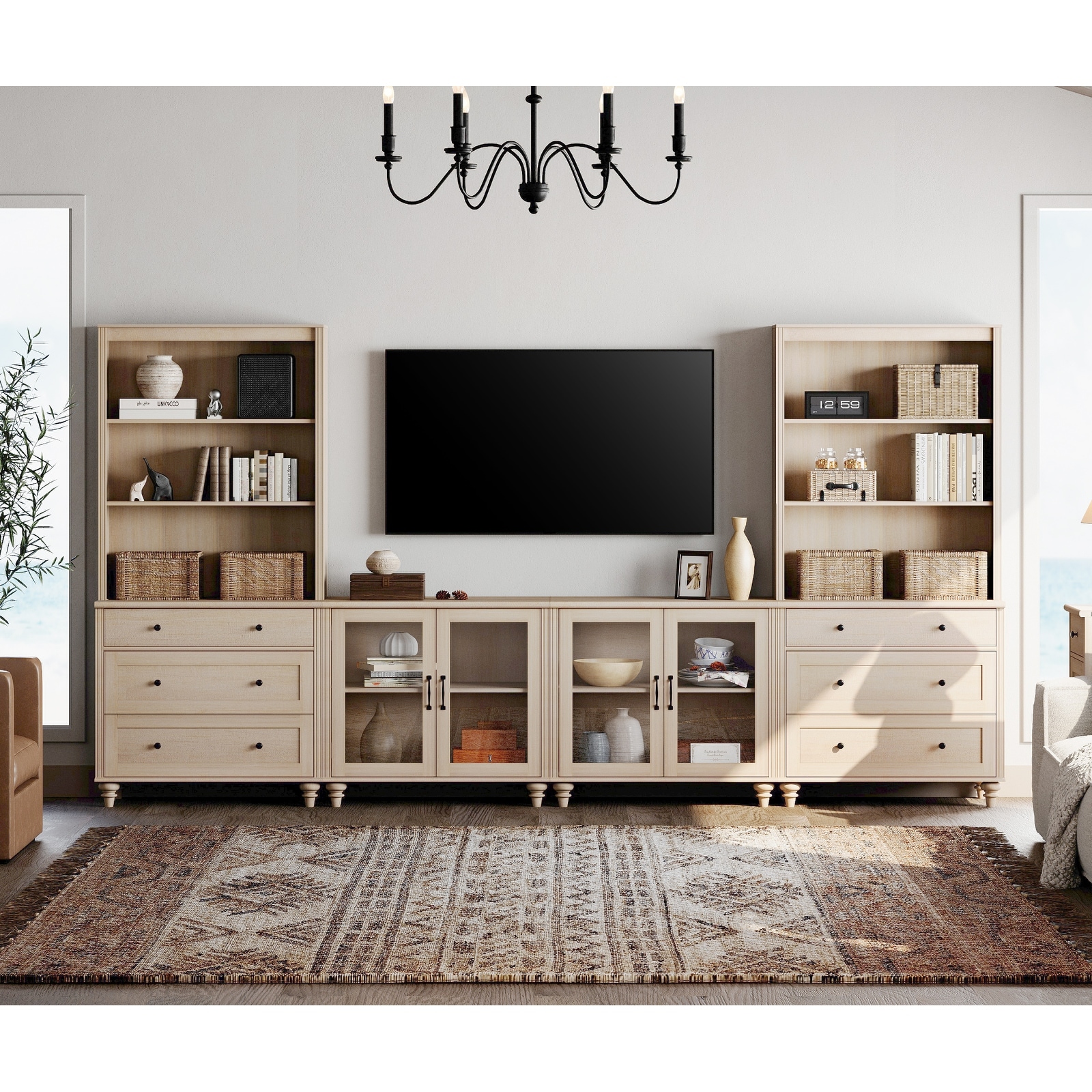 Light Beige Farmhouse TV Stand with Wooden Doors & Drawers - 8-Doors