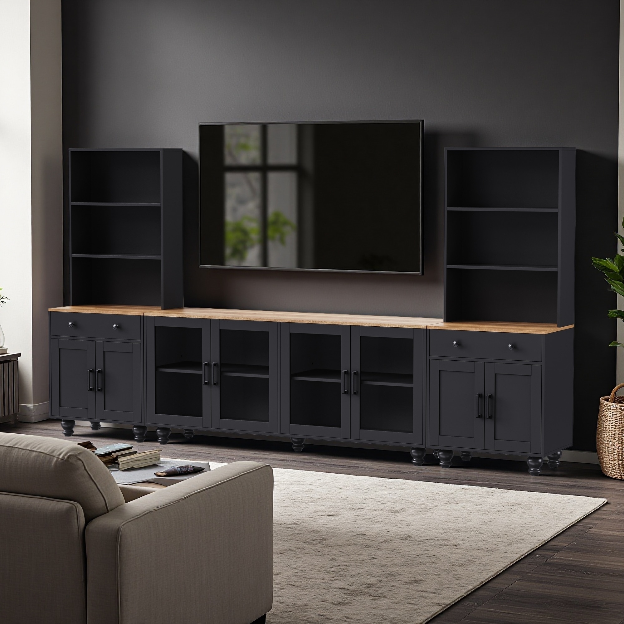 110" TV Stand with Tempered Glass Doors, Adjustable Shelves and Tall Bookshelves