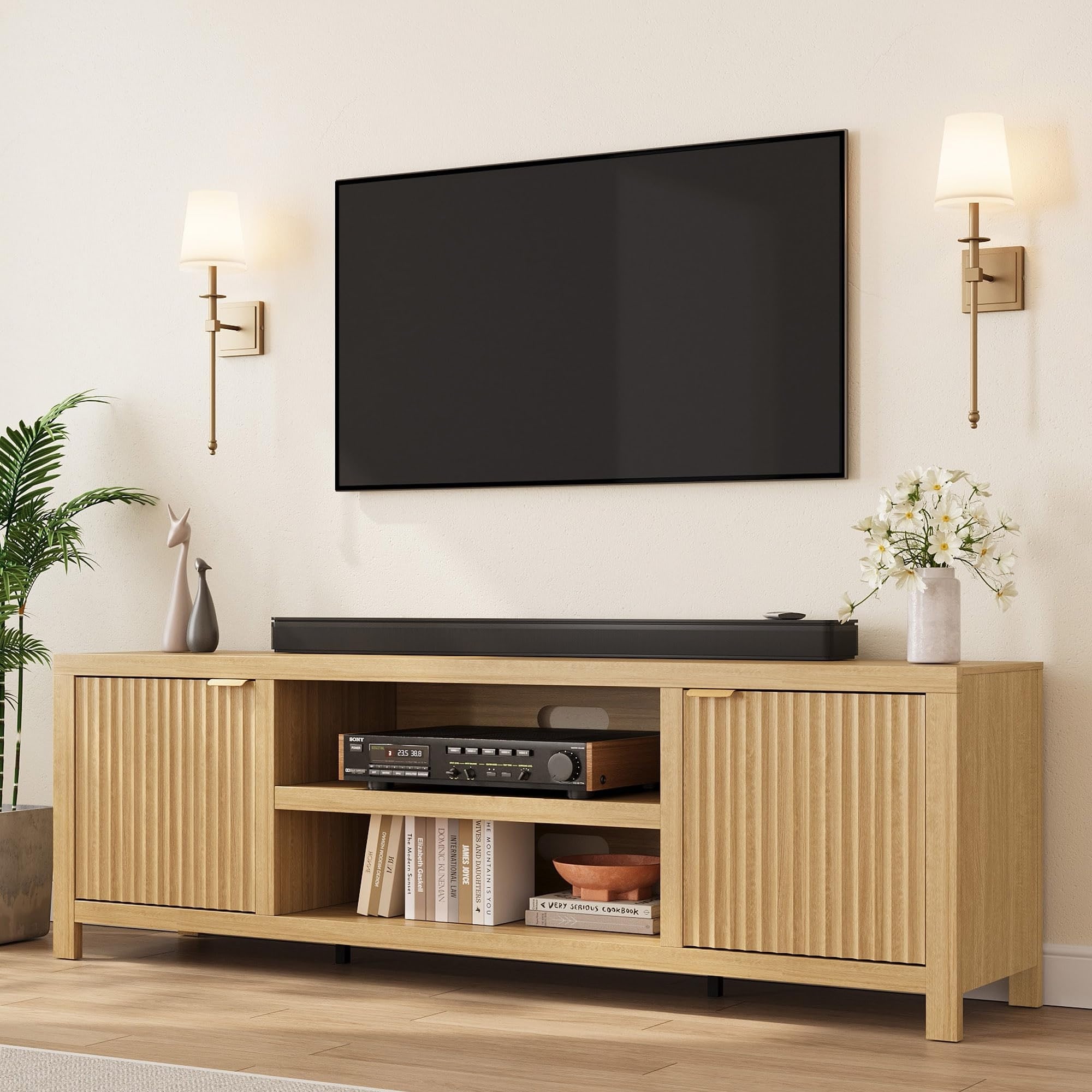 70" Fluted TV Stand for 80 Inch TV, Modern Wooden Media Console with Storage, Gold Handles & Fluted Doors