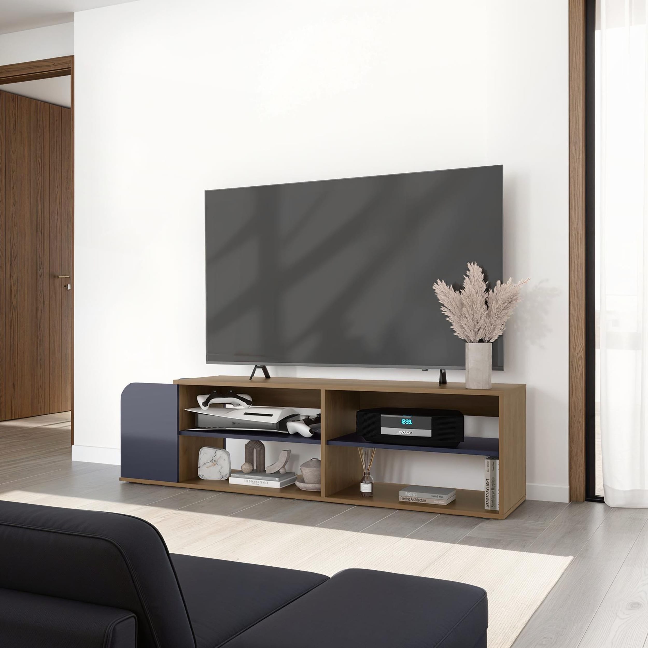 Modern TV Stand with 4 Spacious Shelves, Natural Oak and Alby Blue Finish for Living Rooms