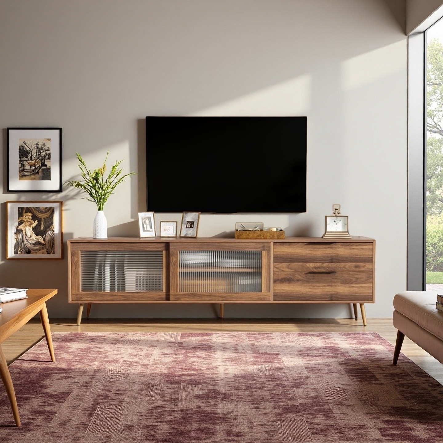 70.8" Mid-Century Walnut TV Console with Sliding Glass Doors, Dual Drawers & Storage Cabinet, Media Stand for TVs Over 75"