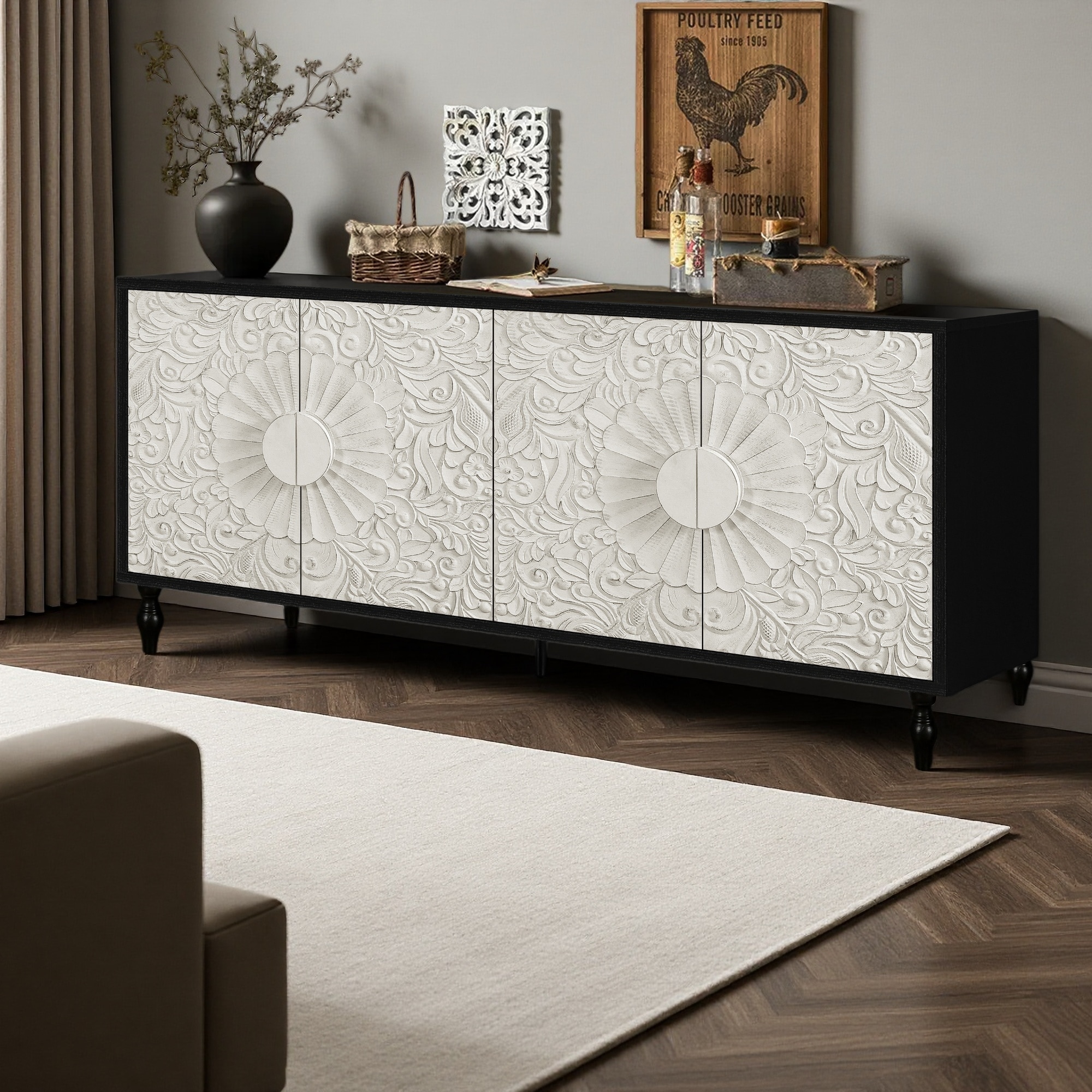63" TV Stand Cabinet with Carved White Doors, Black Frame, Adjustable Shelves, Roman Column Feet, for Living Room and Entryway