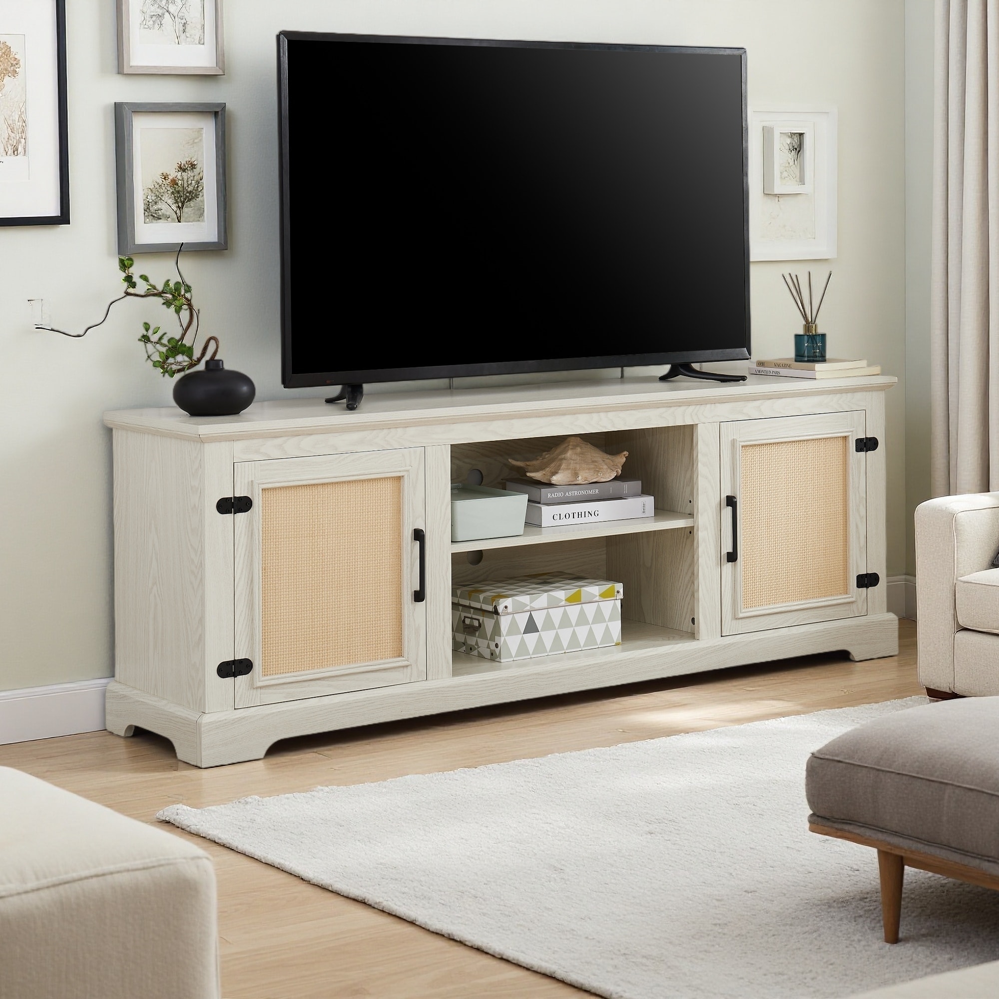 Rattan TV Stand with 3 Cabinets and 2 Drawers for TVs up to 80"