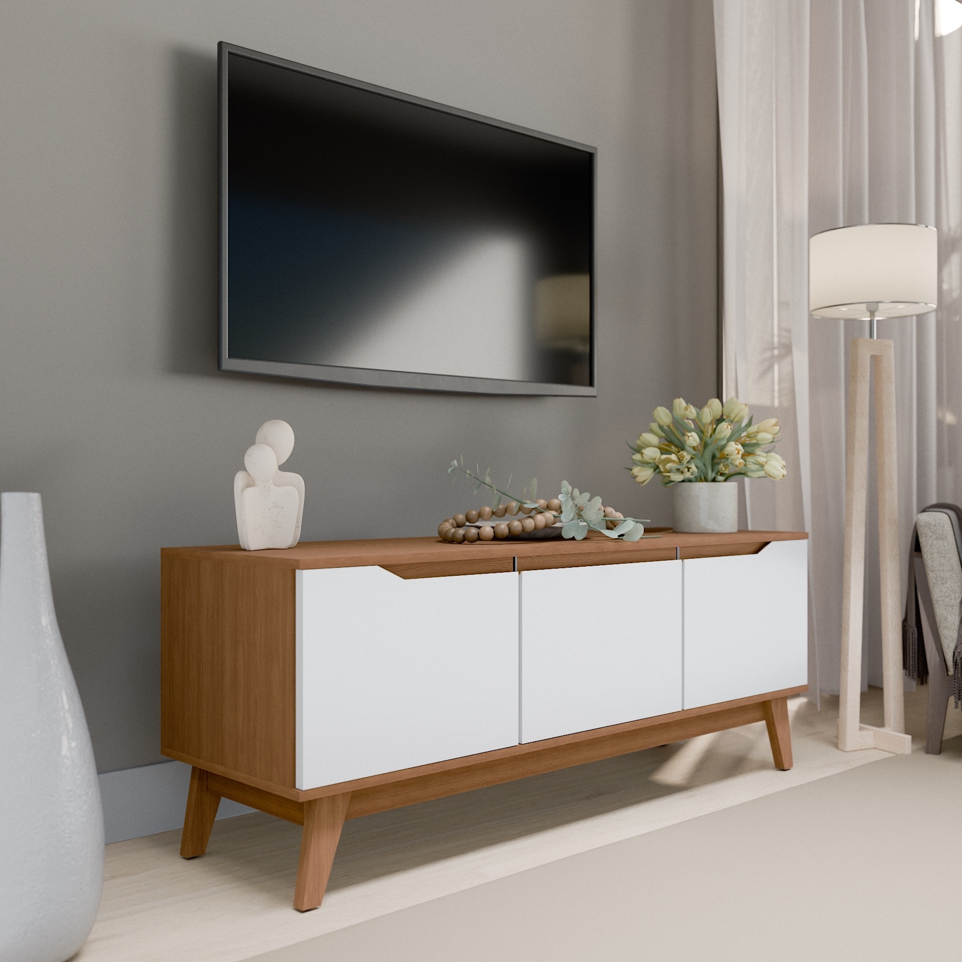 63'' Mid-Century Modern Extendable TV Stand, Farmhouse Entertainment Center for TVs up to 75'' with Storage & Adjustable Panel
