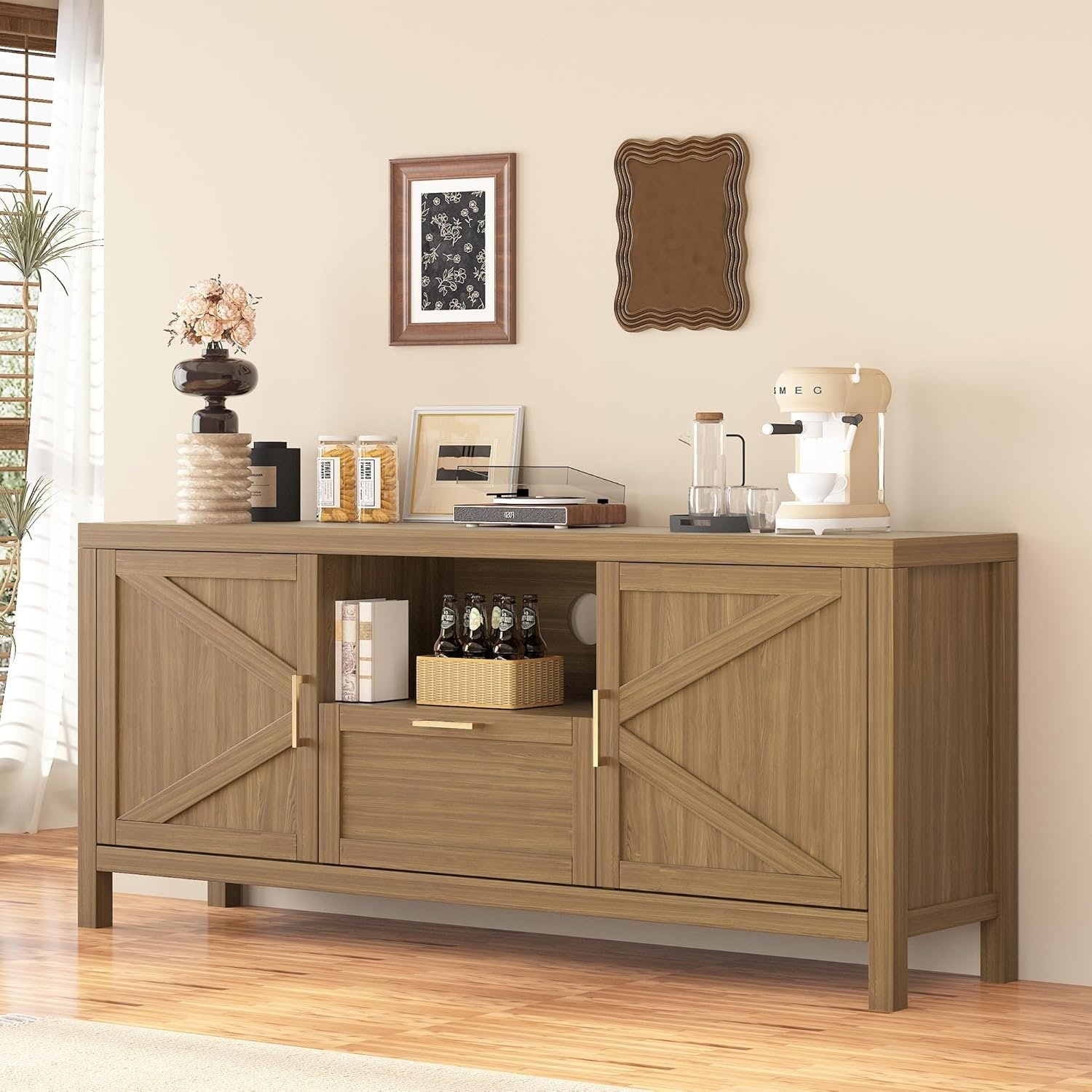 Roomfitters Mid-Century Farmhouse TV Stand with Rustic Handles, Wood Grain Sideboard and Buffet Cabinet