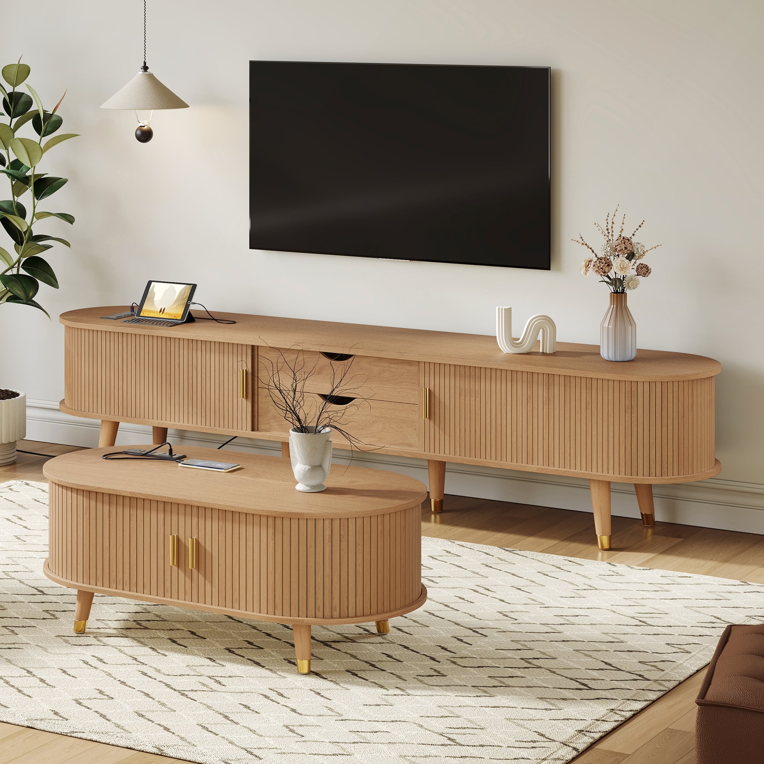 Wooden Farmhouse TV Stand & Coffee Table Set with Charging Station and Fluted Sliding Doors for TVs up to 80 Inch