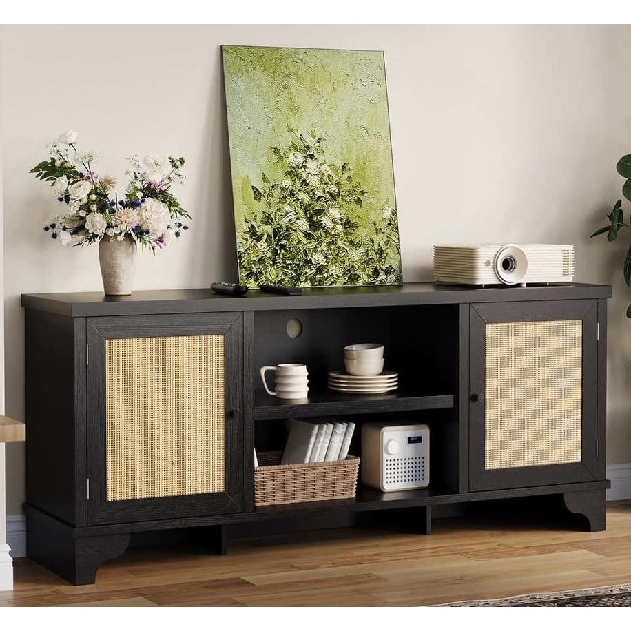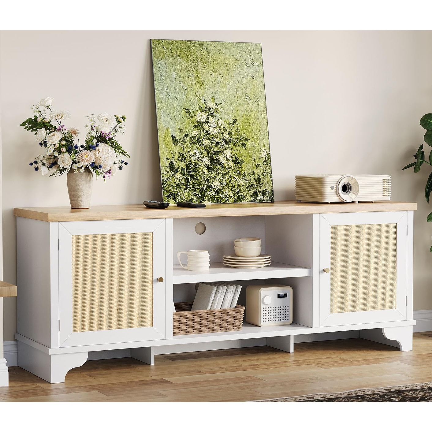 61.8" Rattan TV Stand for TVs Up to 70 Inches, Boho Entertainment Center with Cabinets & Open Shelves