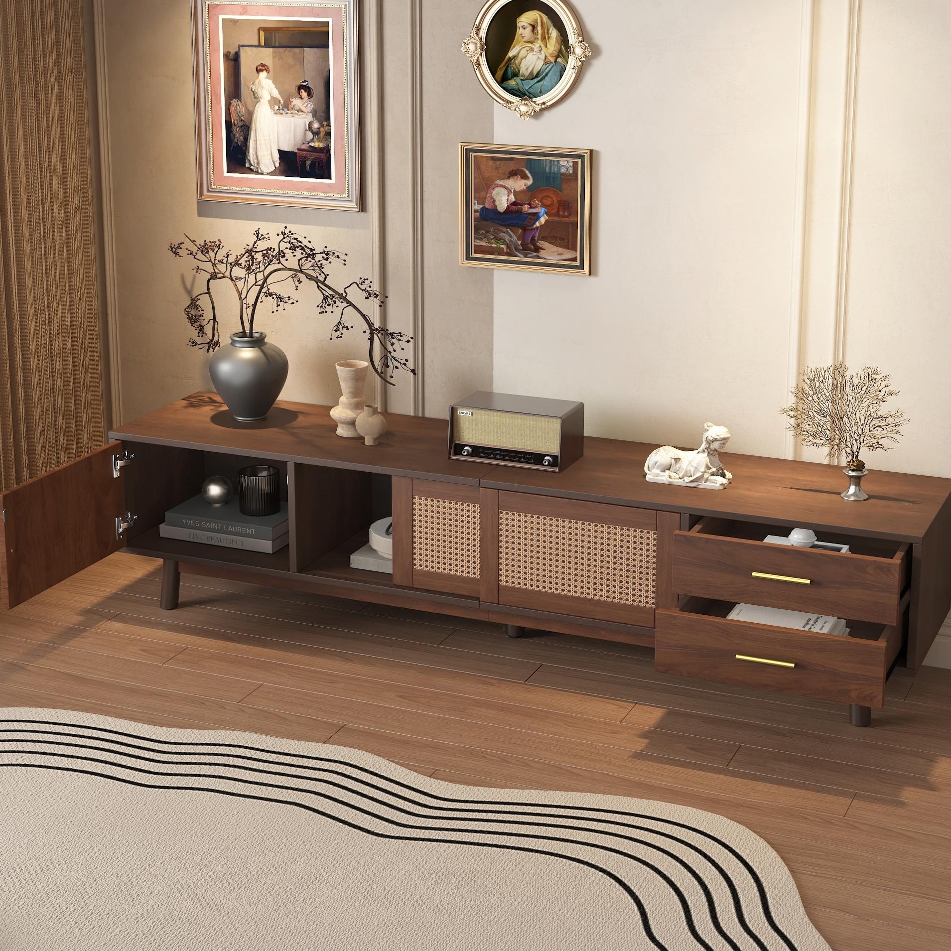 80" Mid Century TV Stand - Rattan Doors, Storage Drawers, Waterproof
