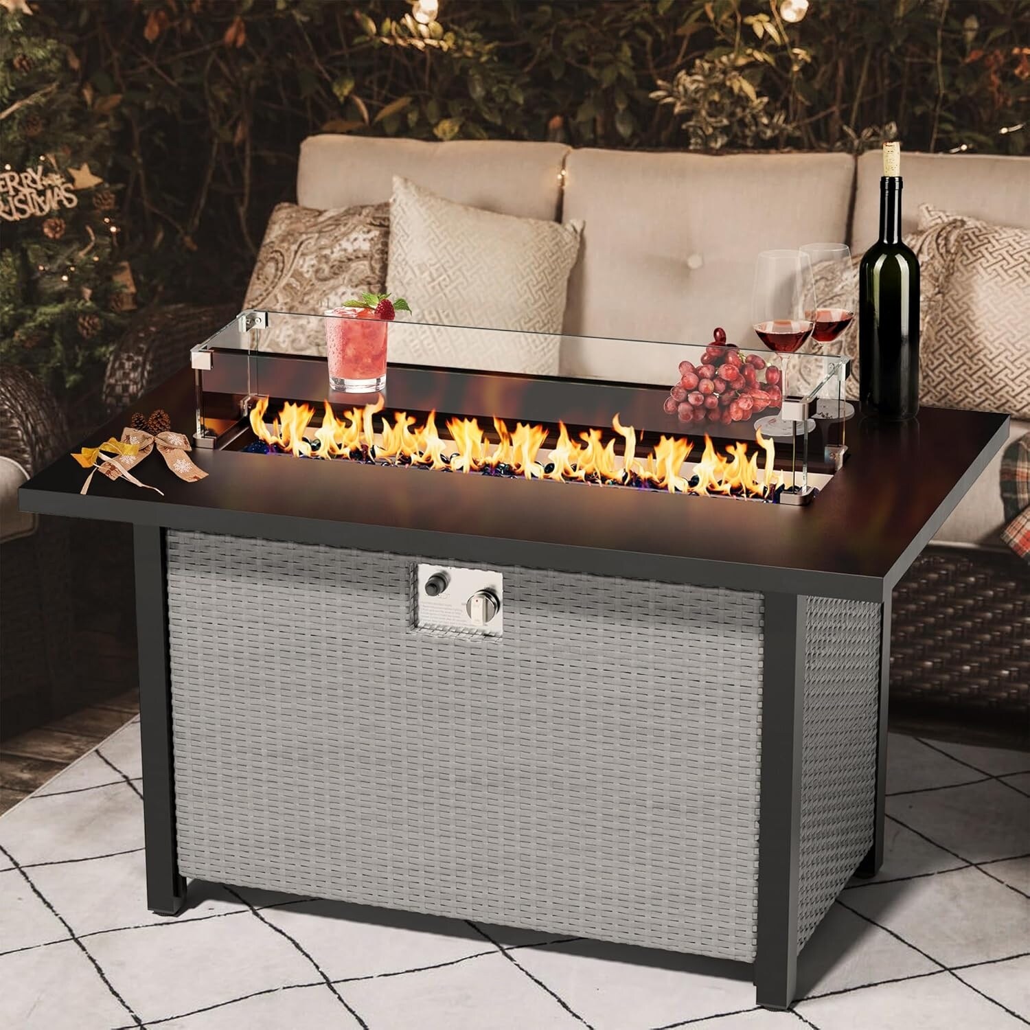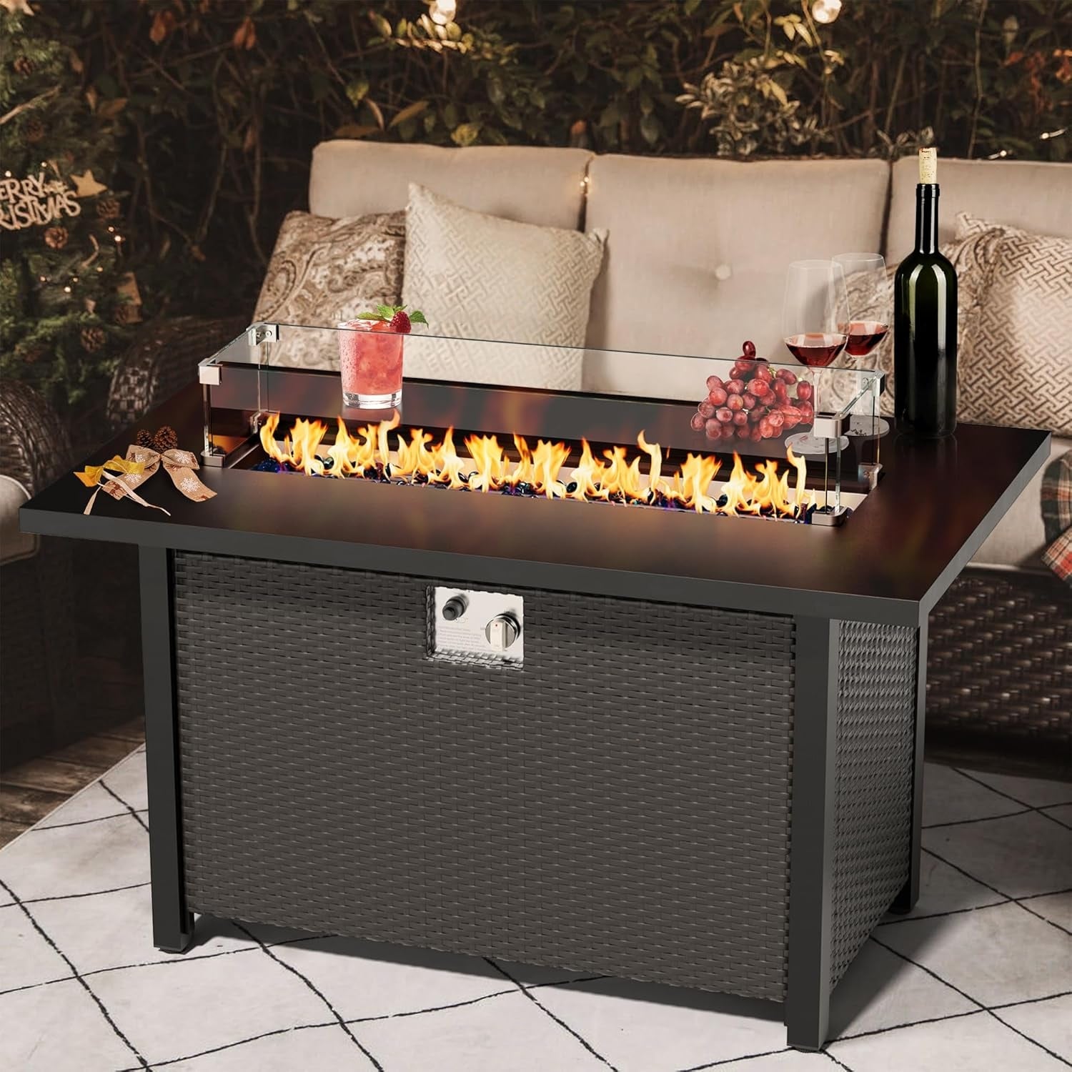 Outdoor Fire Pit Table, 45in 50000 BTU Wicker Patio Propane Gas Fire Pit with Glass Wind Guard, Aluminum Tabletop