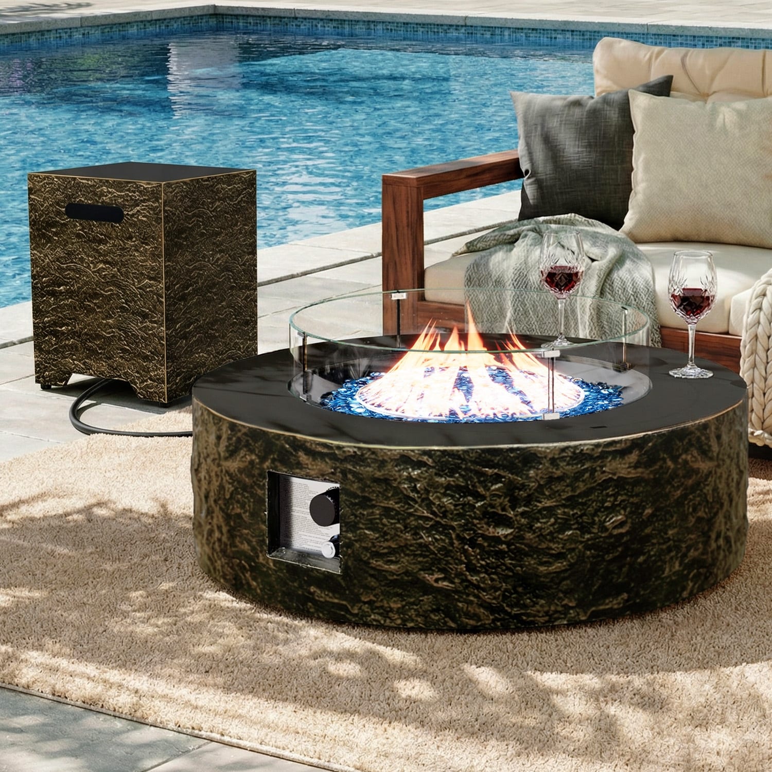 42-inch Round Concrete Propane Fire Pit Table with Tank Cover and Wind Guard,Bronze Surface - N/A