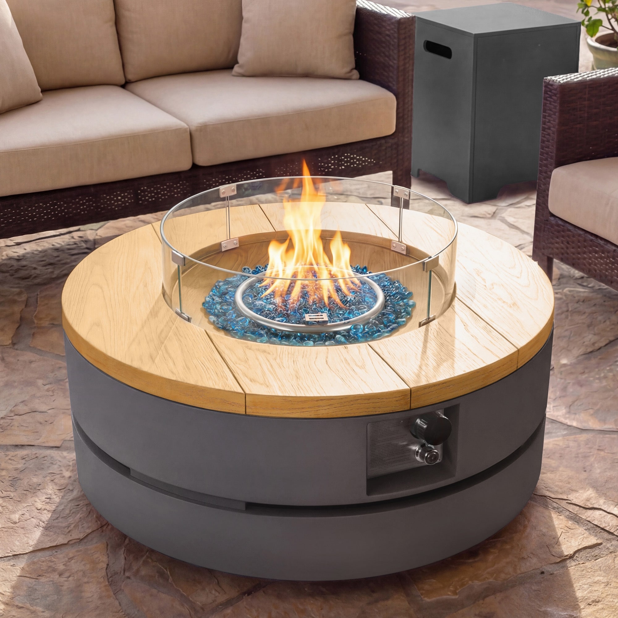 38-inch Round Concrete Propane Fire Pit Table with Tank Cover and Wind Guard,Wood-Look Textured Surface - N/A