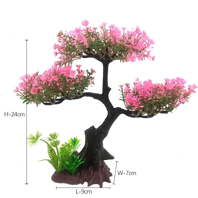 Aquarium Artificial Plants: Pink Cherry Blossom Tree & Grass DEcor Set 7