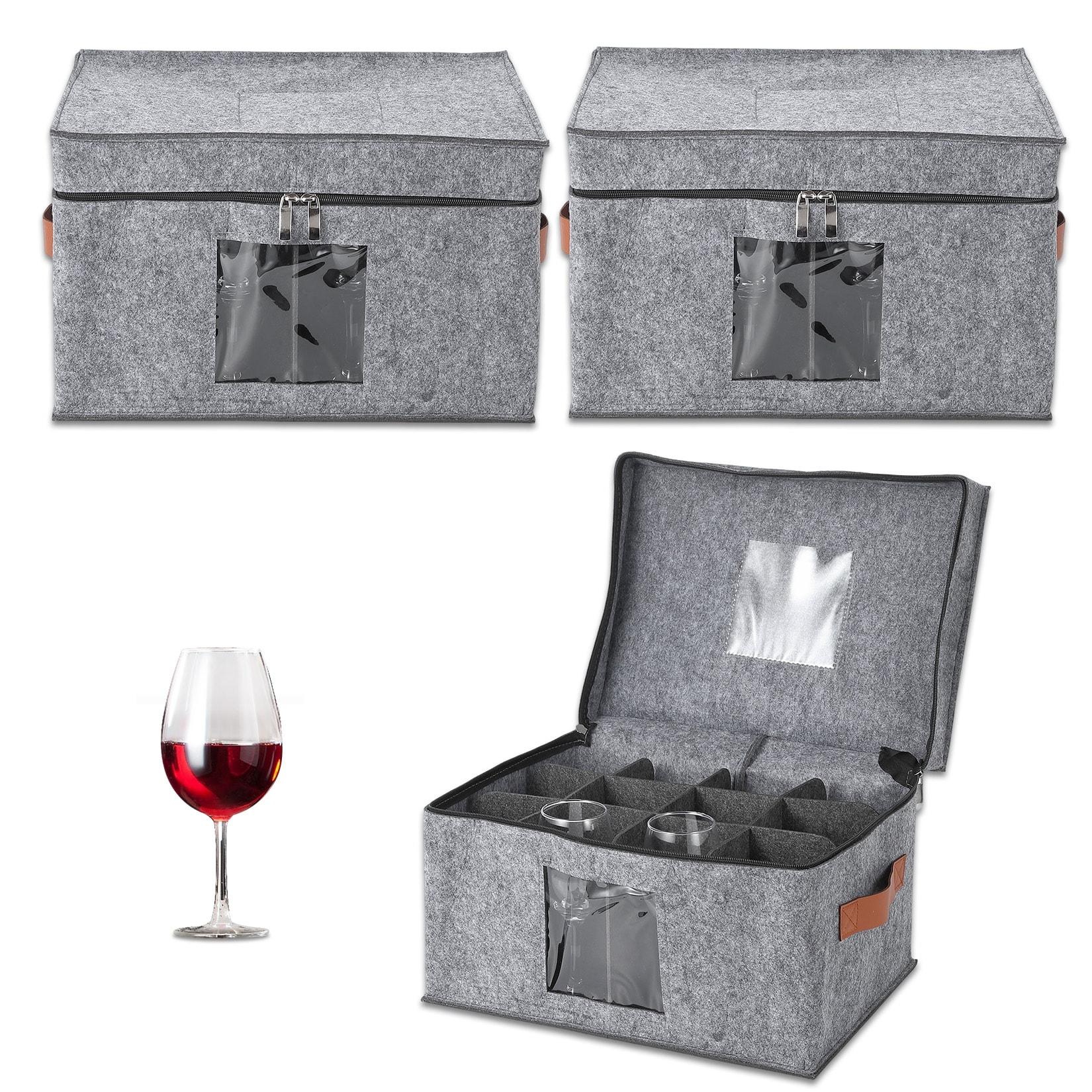 3-Pack Stemware Storage Boxes with Dividers, Felt Wine Glass Organizer with Lids & Handles, Gray. - Gray