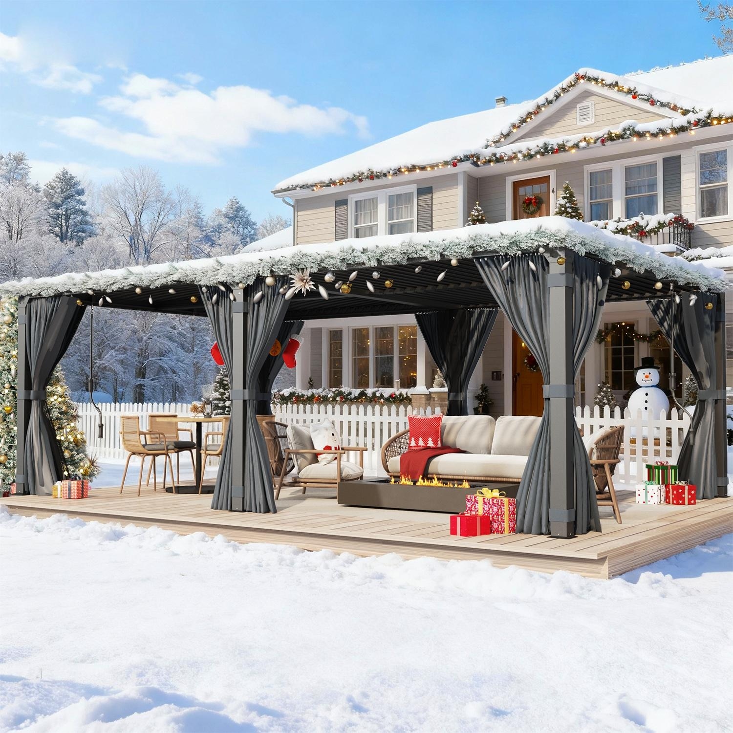Outdoor Louvered Pergola, Outdoor Patio Hardtop Gazebo, Adjustable Metal Roof Curtains and Netting Included