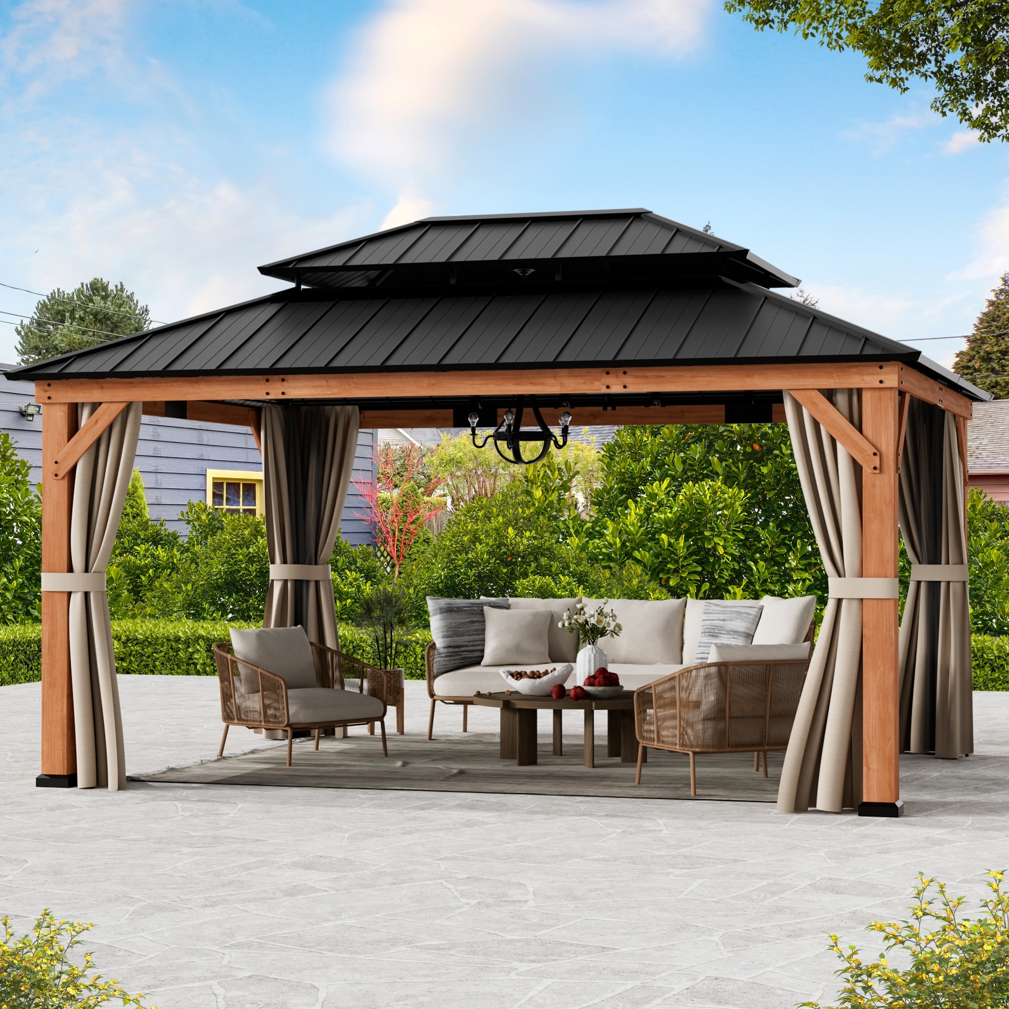 Modern Shade Wood Gazebo 12' x 16', Cedar Framed Grill Gazebo with Netting and Curtain