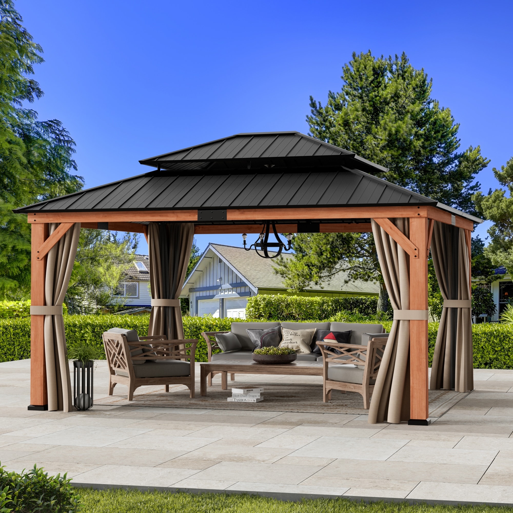 Modern Shade Wood Gazebo 13' x 15', Cedar Framed Grill Gazebo with Netting and Curtain