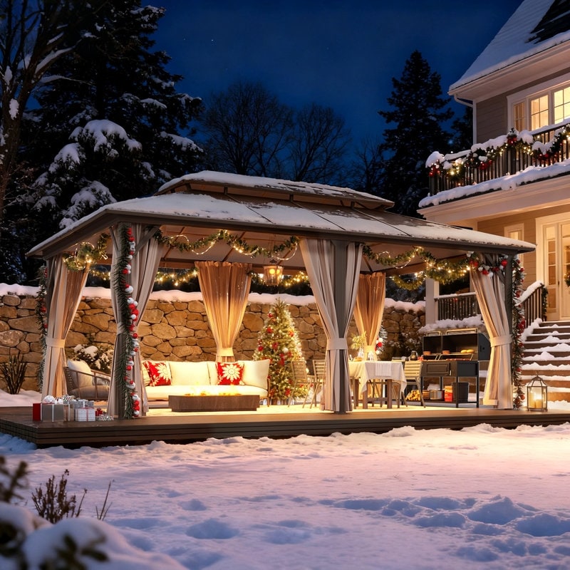 Aluminum Metal Hardtop Permanent Gazebo Pavilion with Galvanized Steel Double Roof Canopy, Curtain and Netting