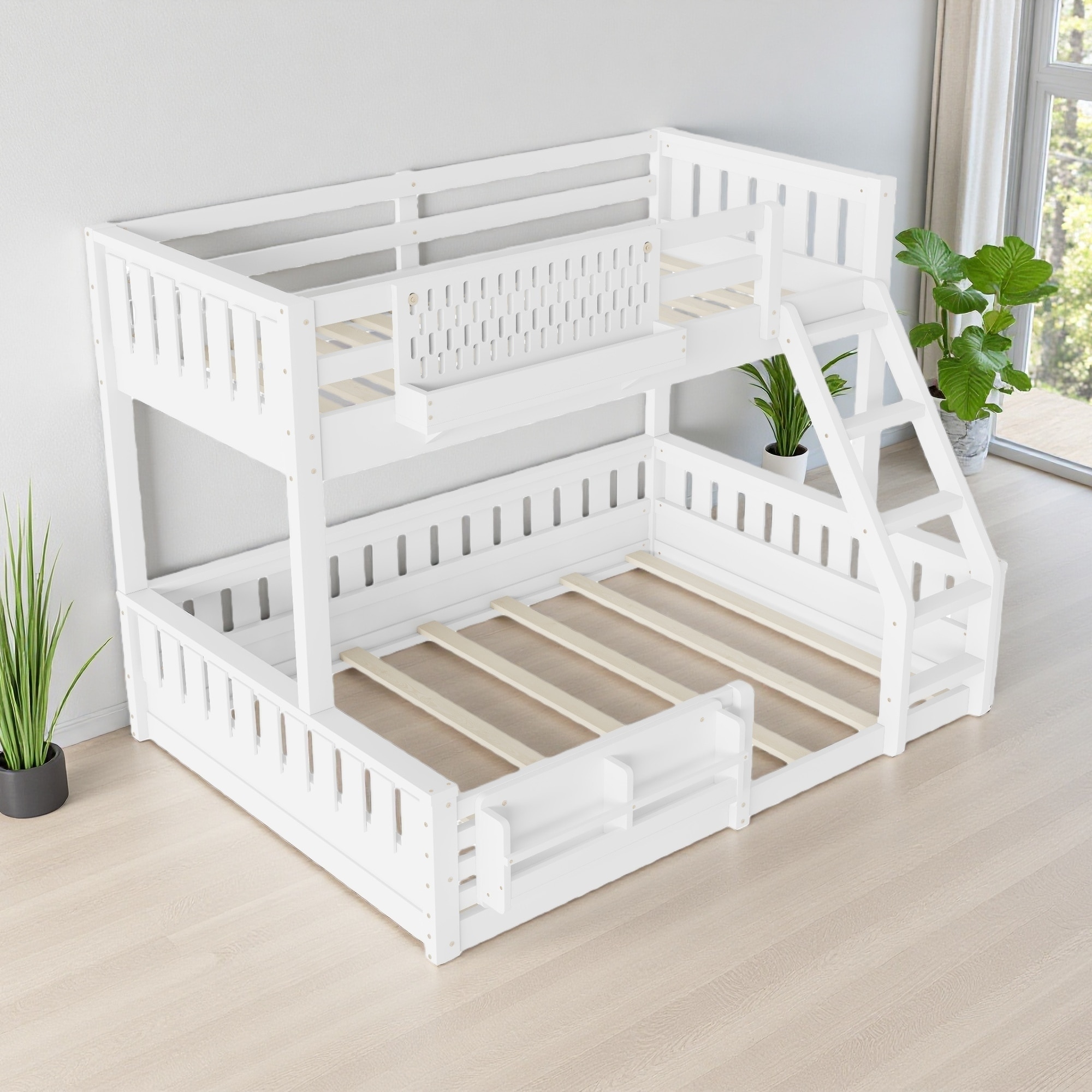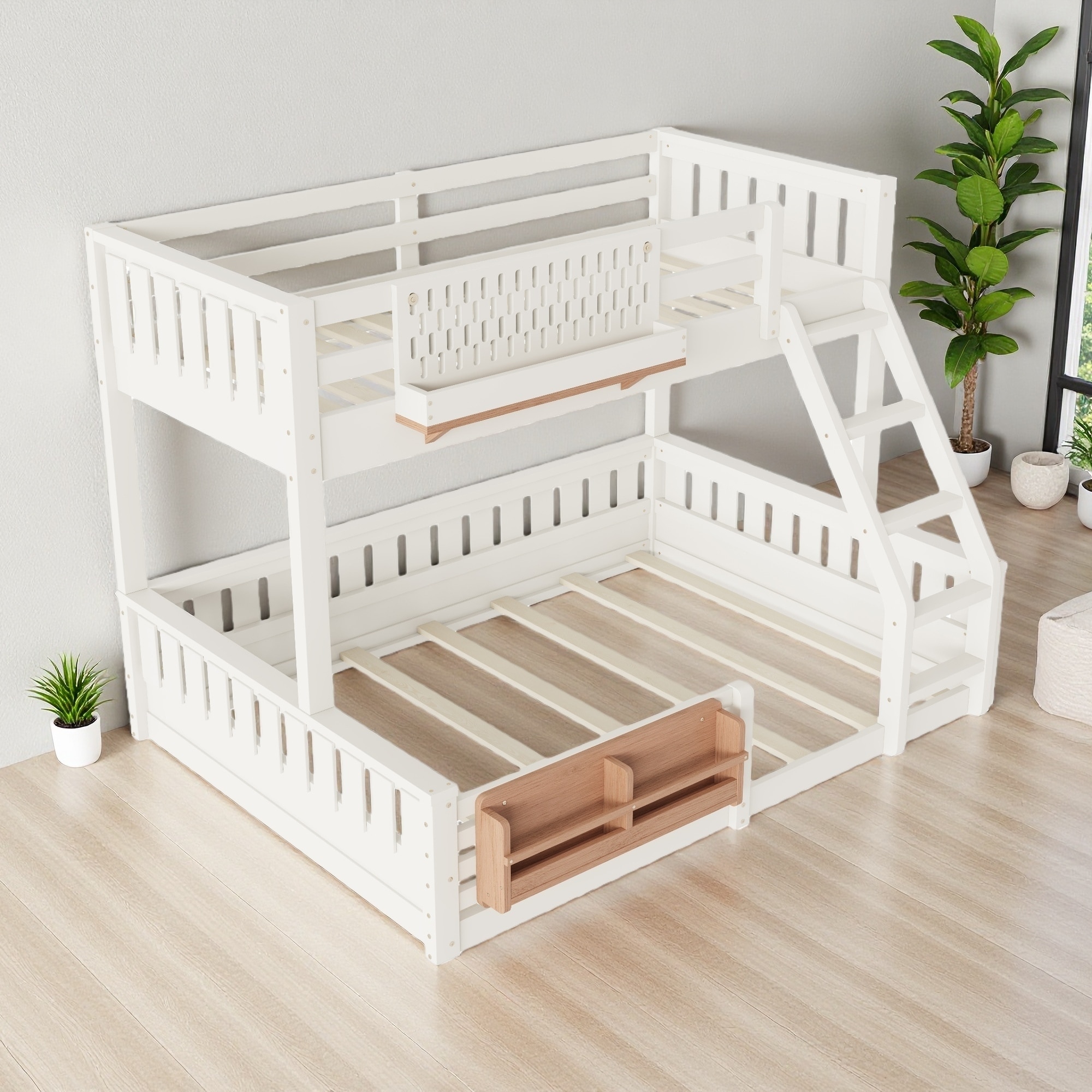 Twin XL Over Queen Wood Bunk Bed with Pegboard, Bookshelf and Ladder