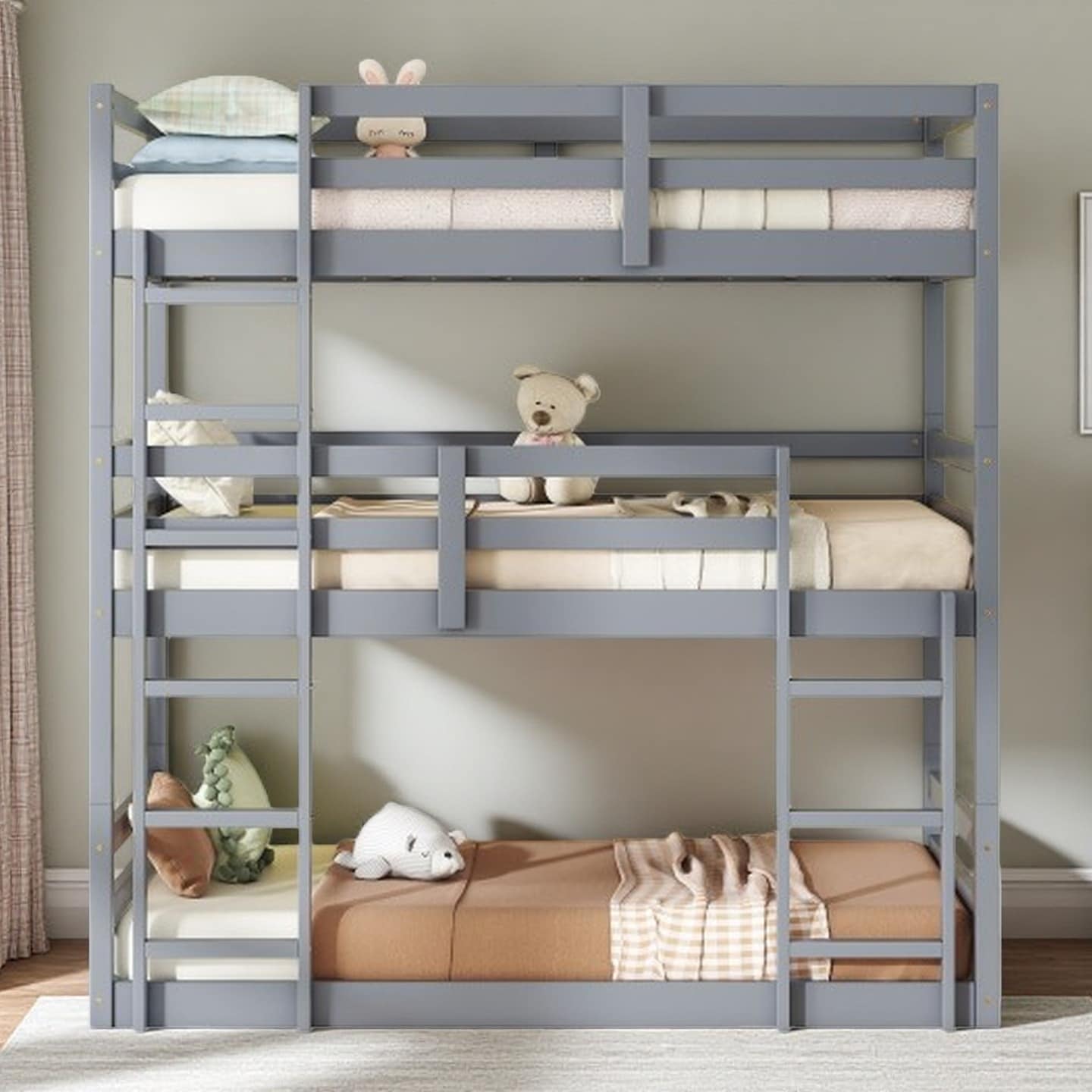 Triple Twin Bunk Bed, Solid Rubberwood Frame with Two Ladders and Full Guardrails