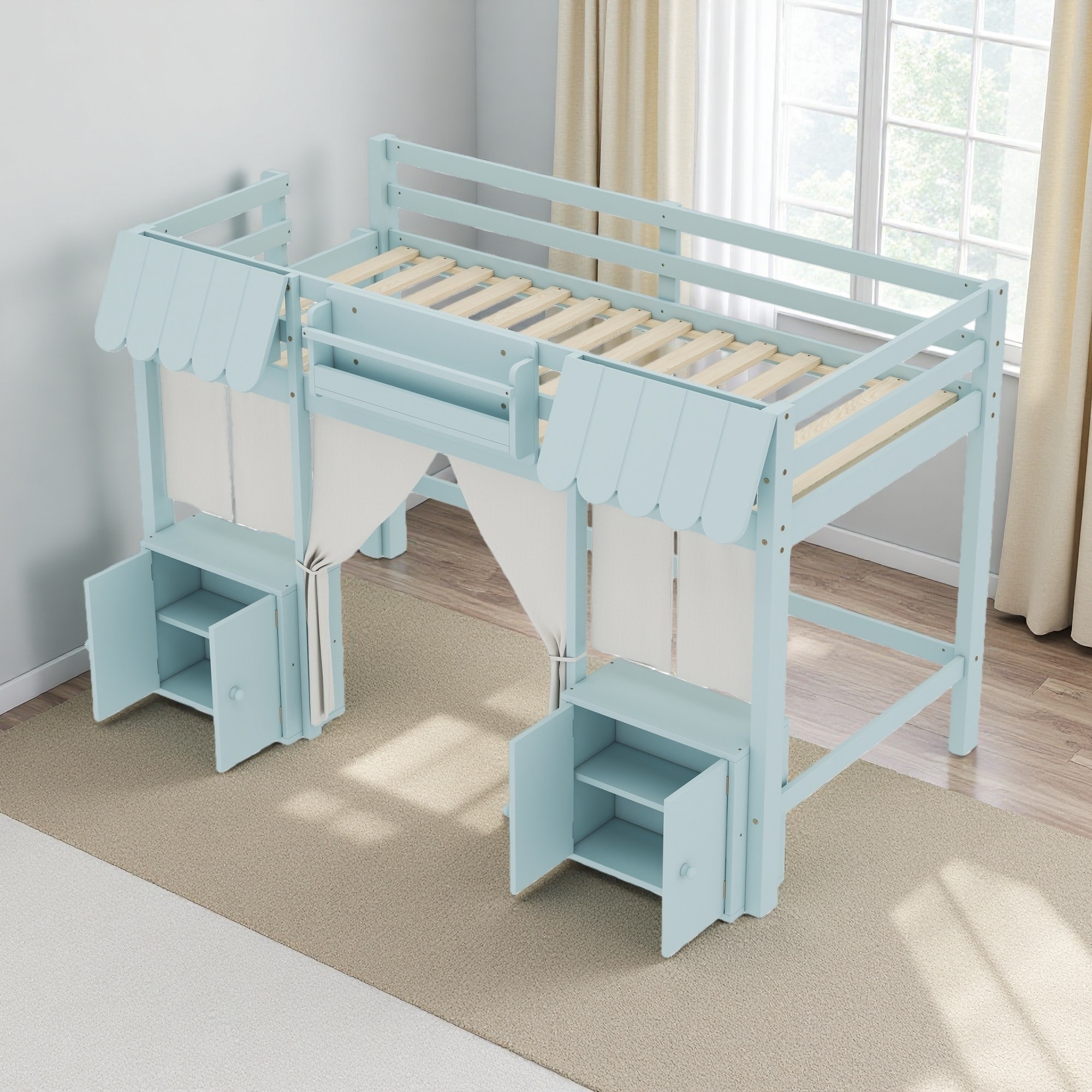 Twin Size Wood Loft Bed with Built-in Bookshelf, Curtain, Storage Shelf and Playful Cottage Design