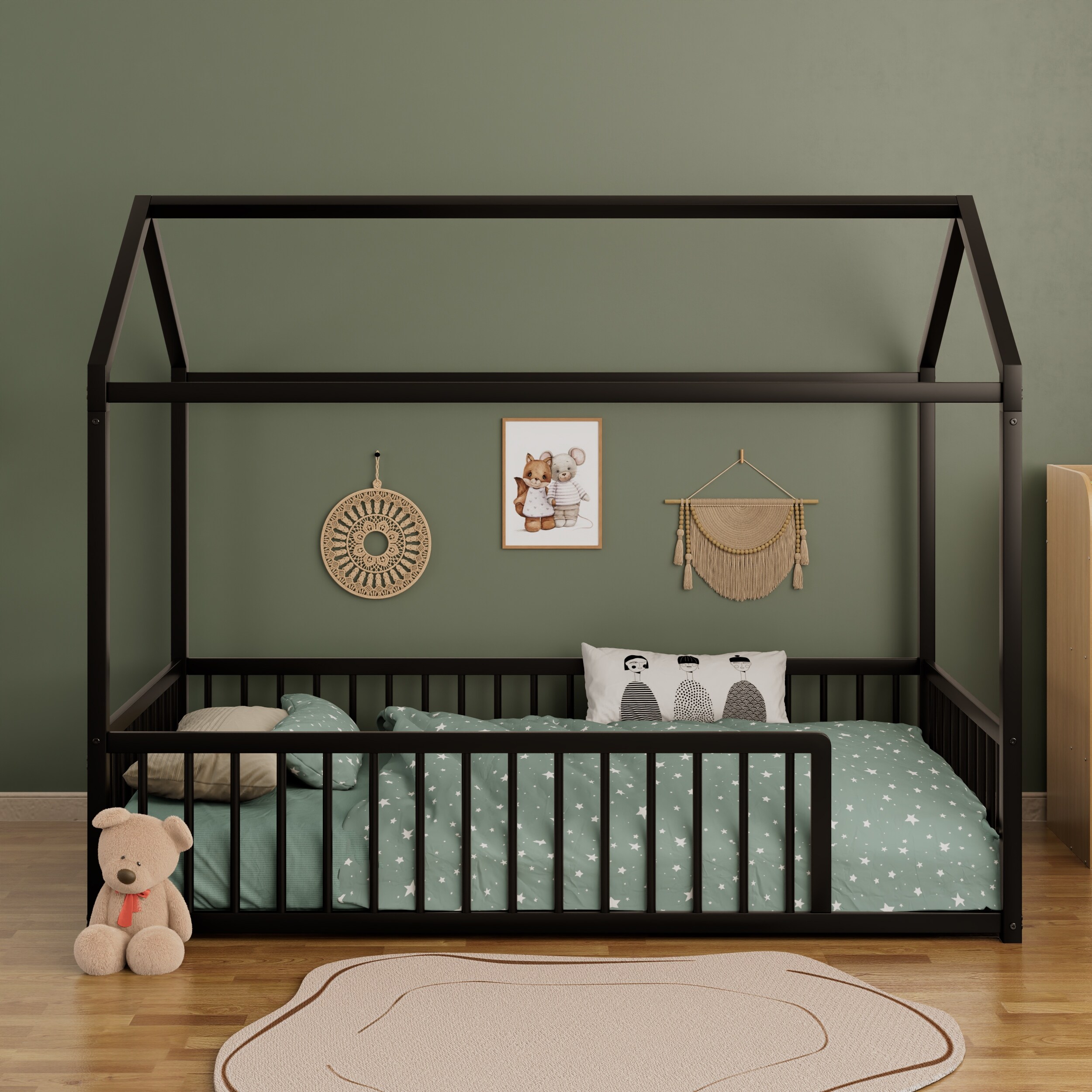 Twin/Full Montessori-Inspired Metal Floor Bed Frame with Fence, House Shaped Bed for Kids and Toddlers, Easy Assemble, No Slats