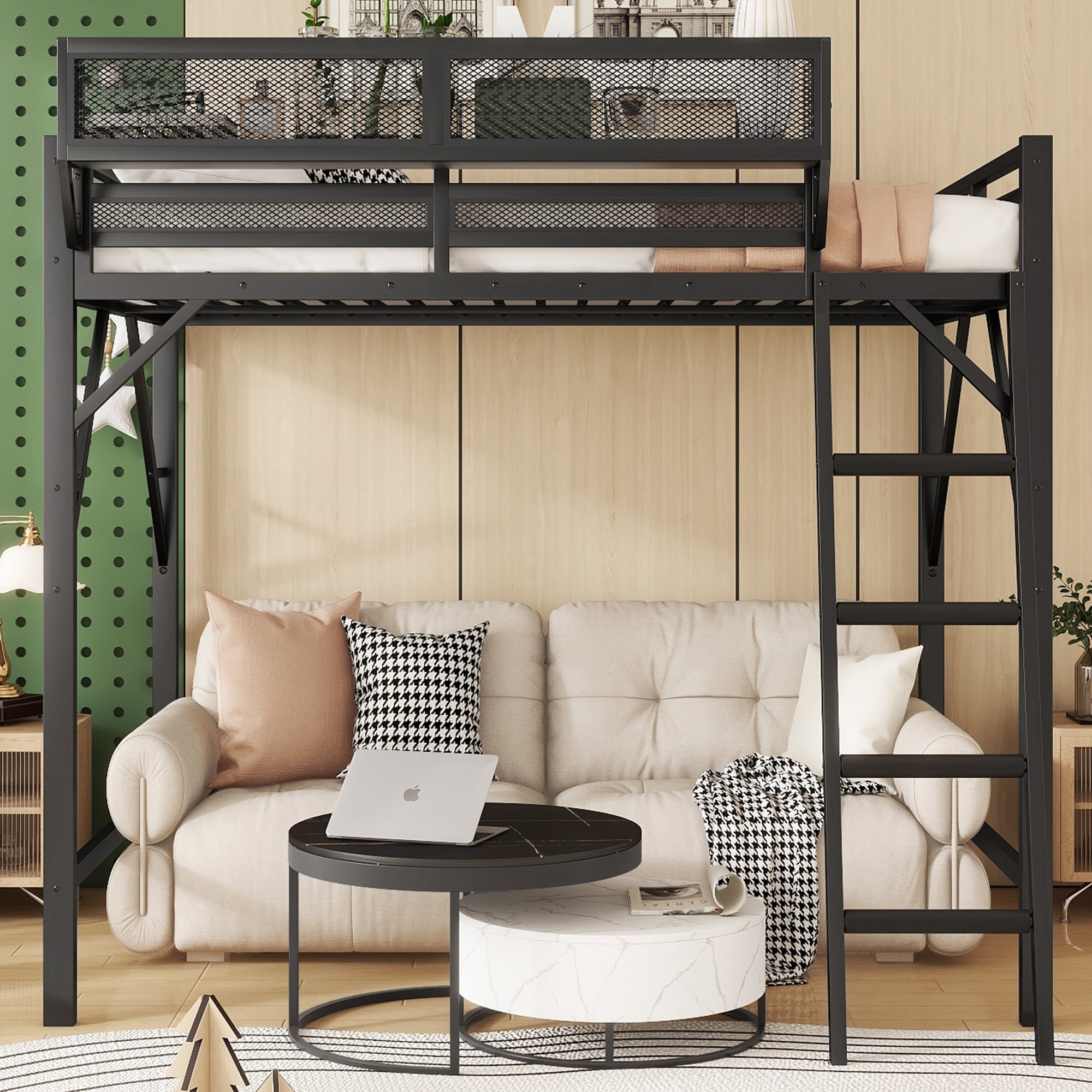 Heavy Duty Metal Loft Bed Frame with Guardrails and Storage Shelves