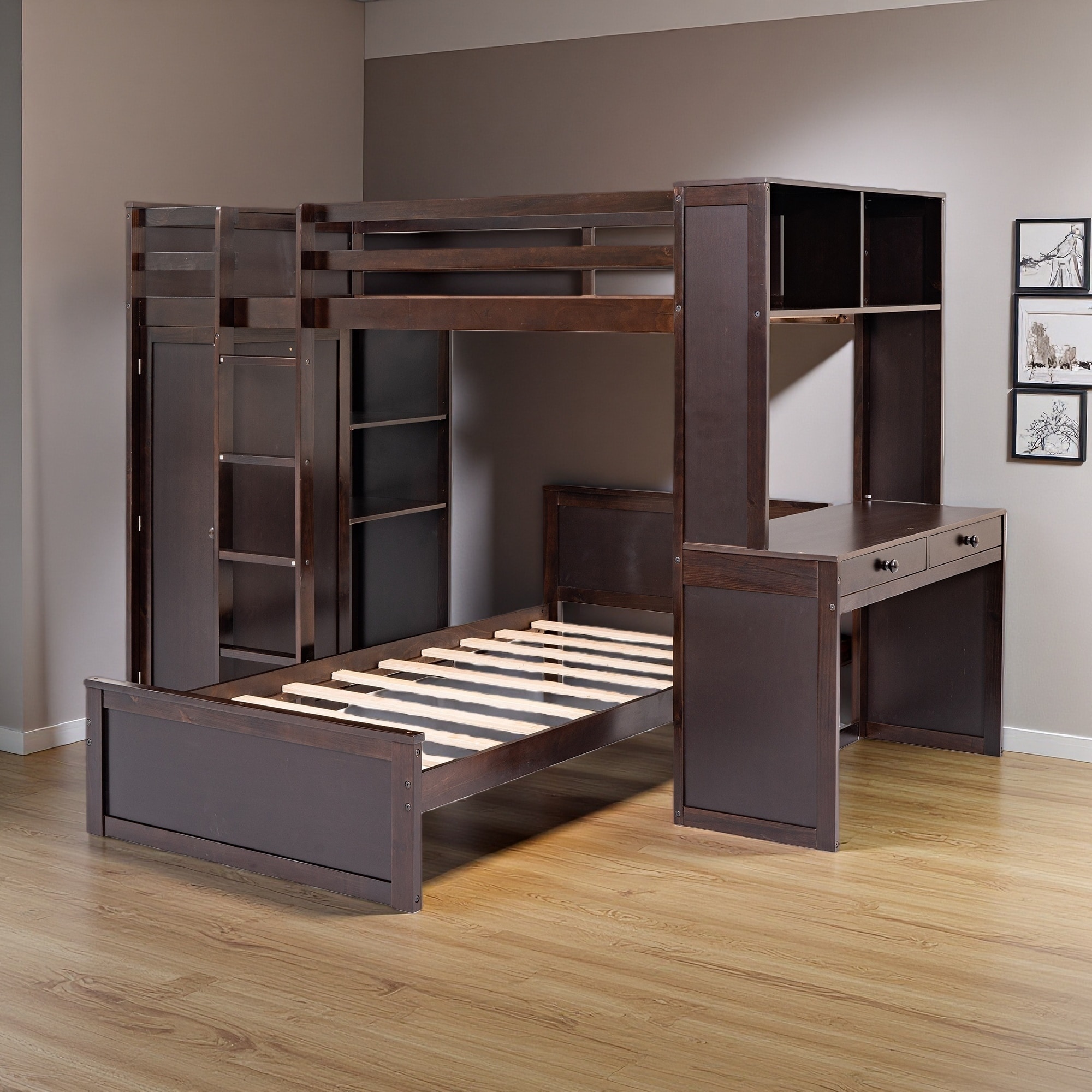 Twin Size Wood Loft Bed with Stand-alone Bed, Shelves, Desk and Wardrobe