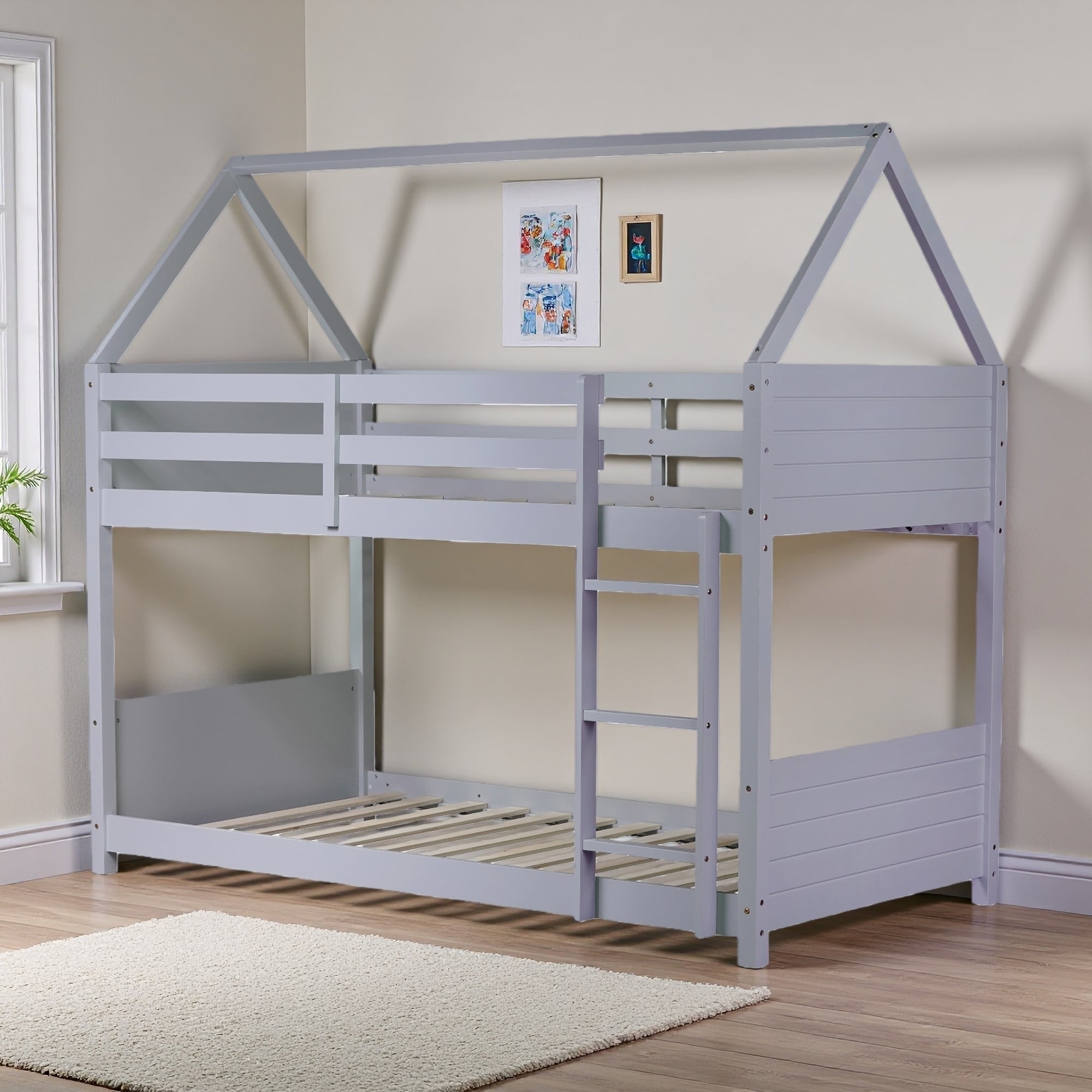 Twin Over Twin Rubber Wood House Floor Bunk Bed with Headboards and Safety Guardrails
