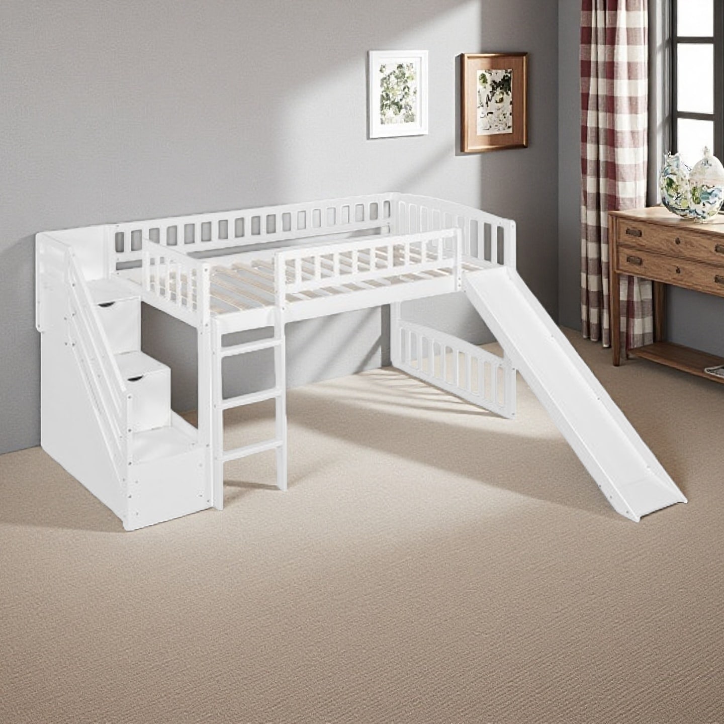 Twin Size Solid Wood Loft Bed with Stairway, Convertible Ladder, Slide, 2 Drawers for Storage, and Guardrails
