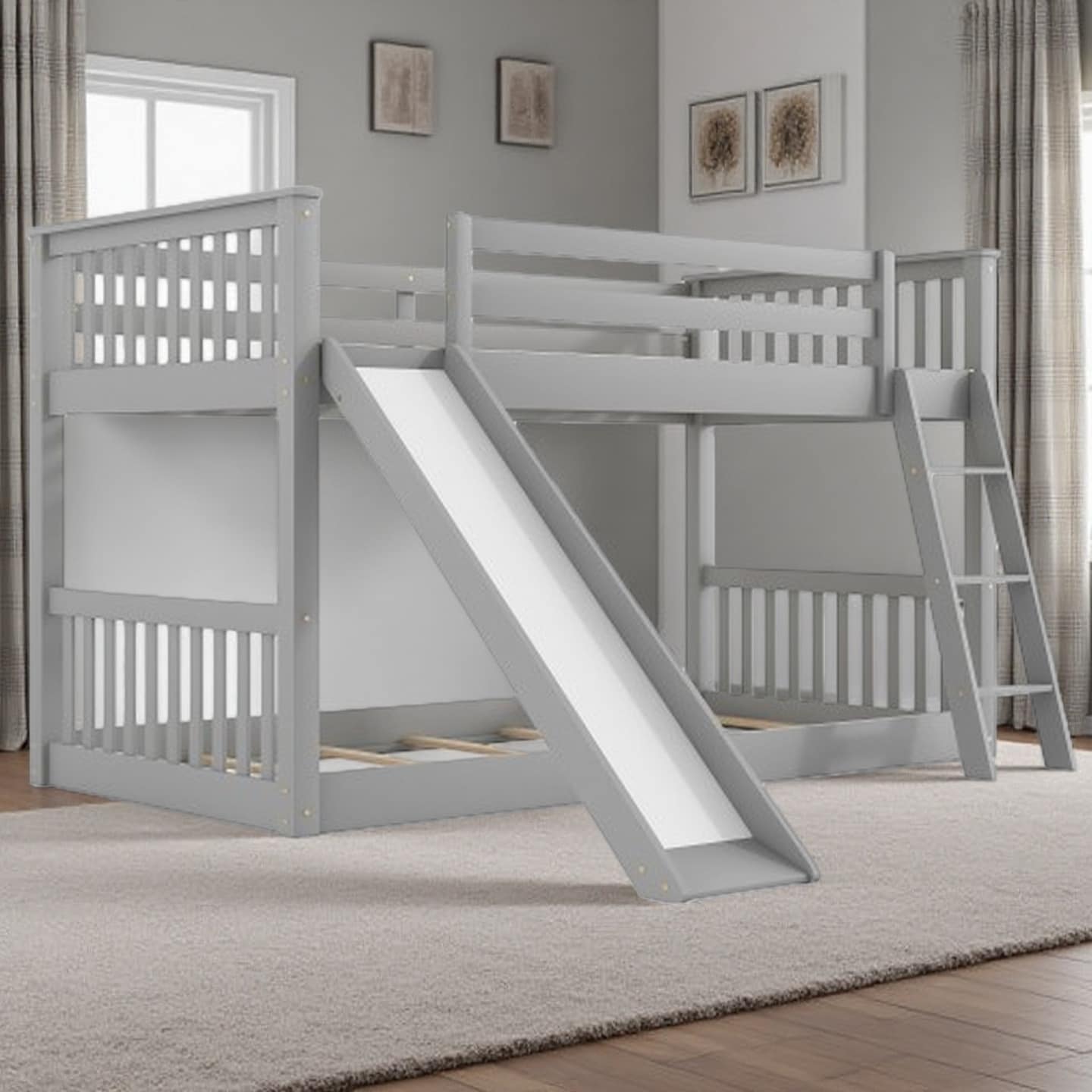 Twin Over Twin Low Bunk Bed with Reversible Slide and Built-In Ladder, Wooden Frame with Guardrails