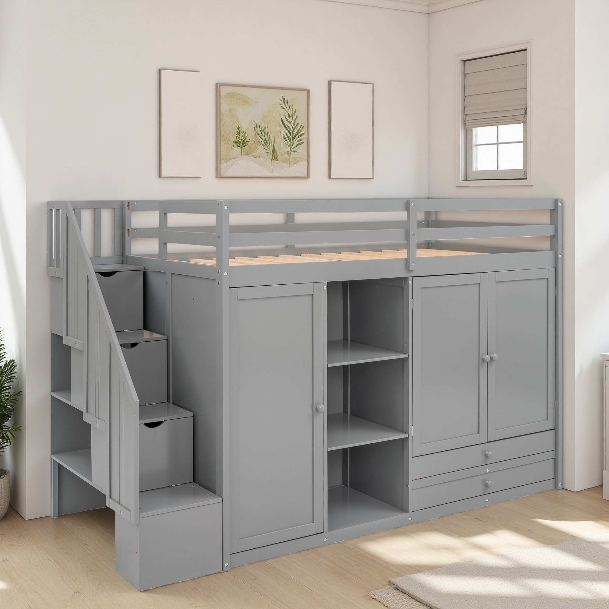 Full Size Loft Bed with Wardrobe,Desk and Shelves
