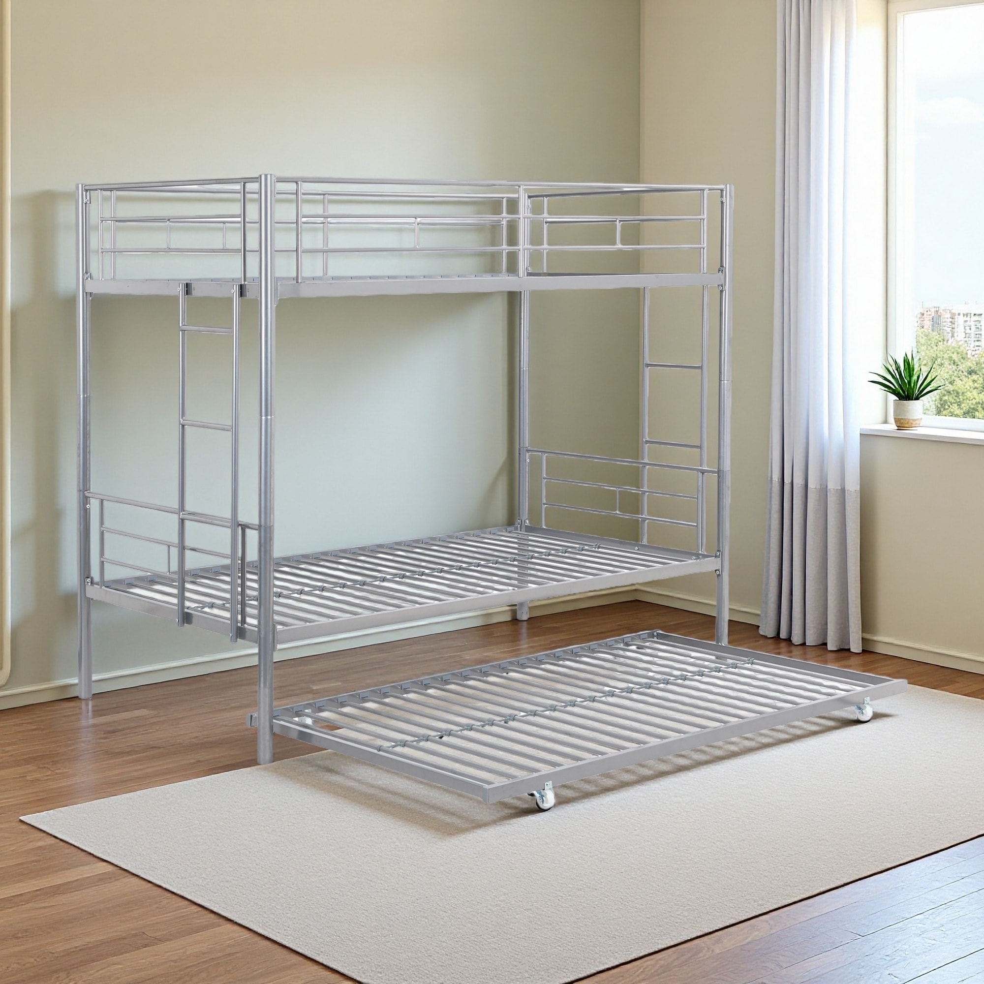 Twin Over Twin Metal Bunk Bed with Trundle, Sturdy Steel Construction and Safe Stairs