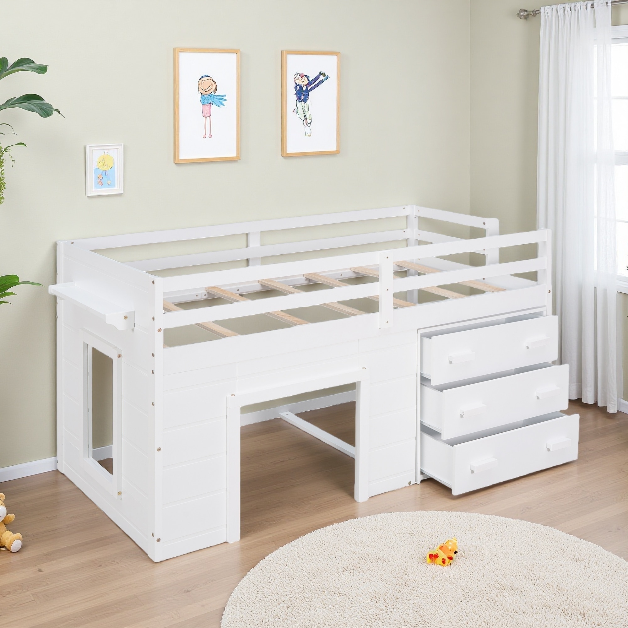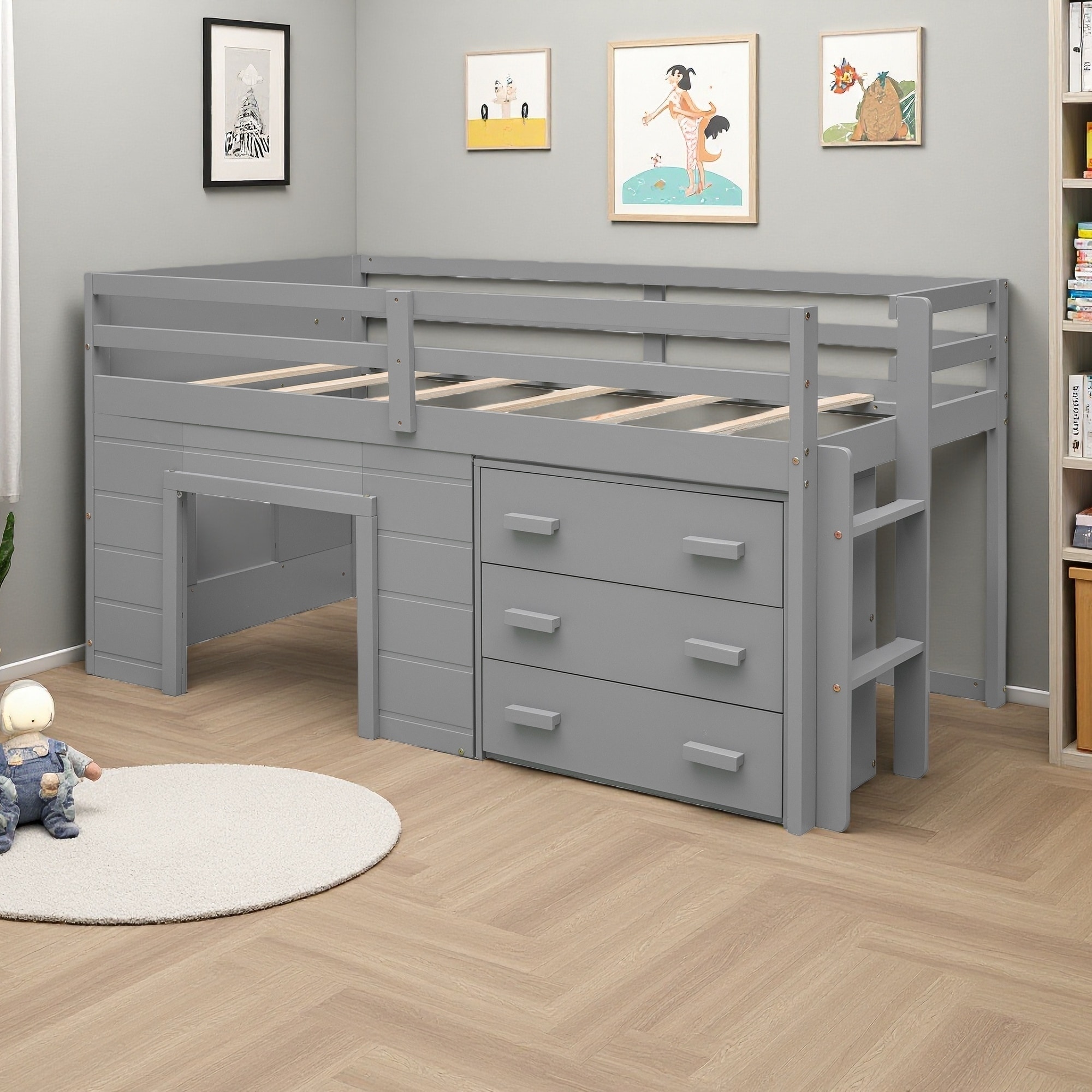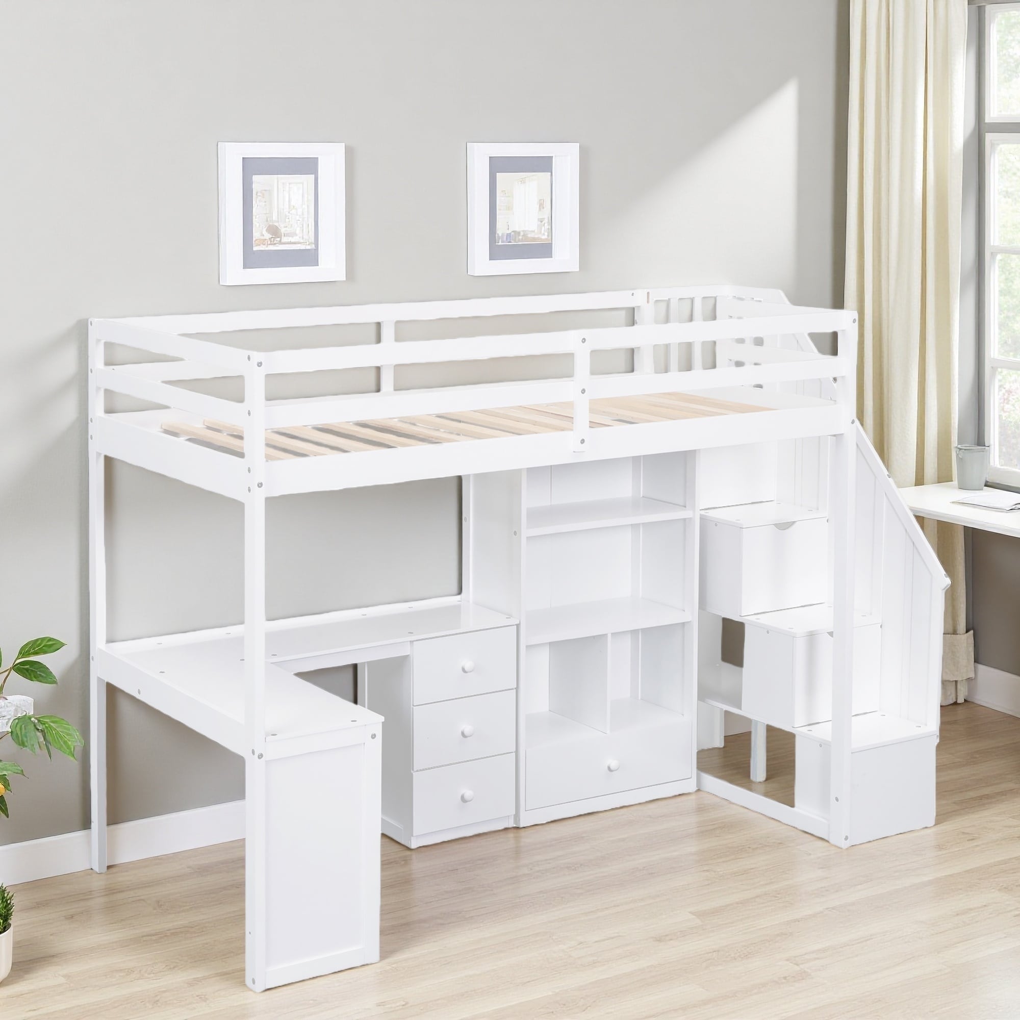 Twin Size Pine Loft Bed with L-Shaped Desk, Storage Staircase, 3 Drawers and Cabinet