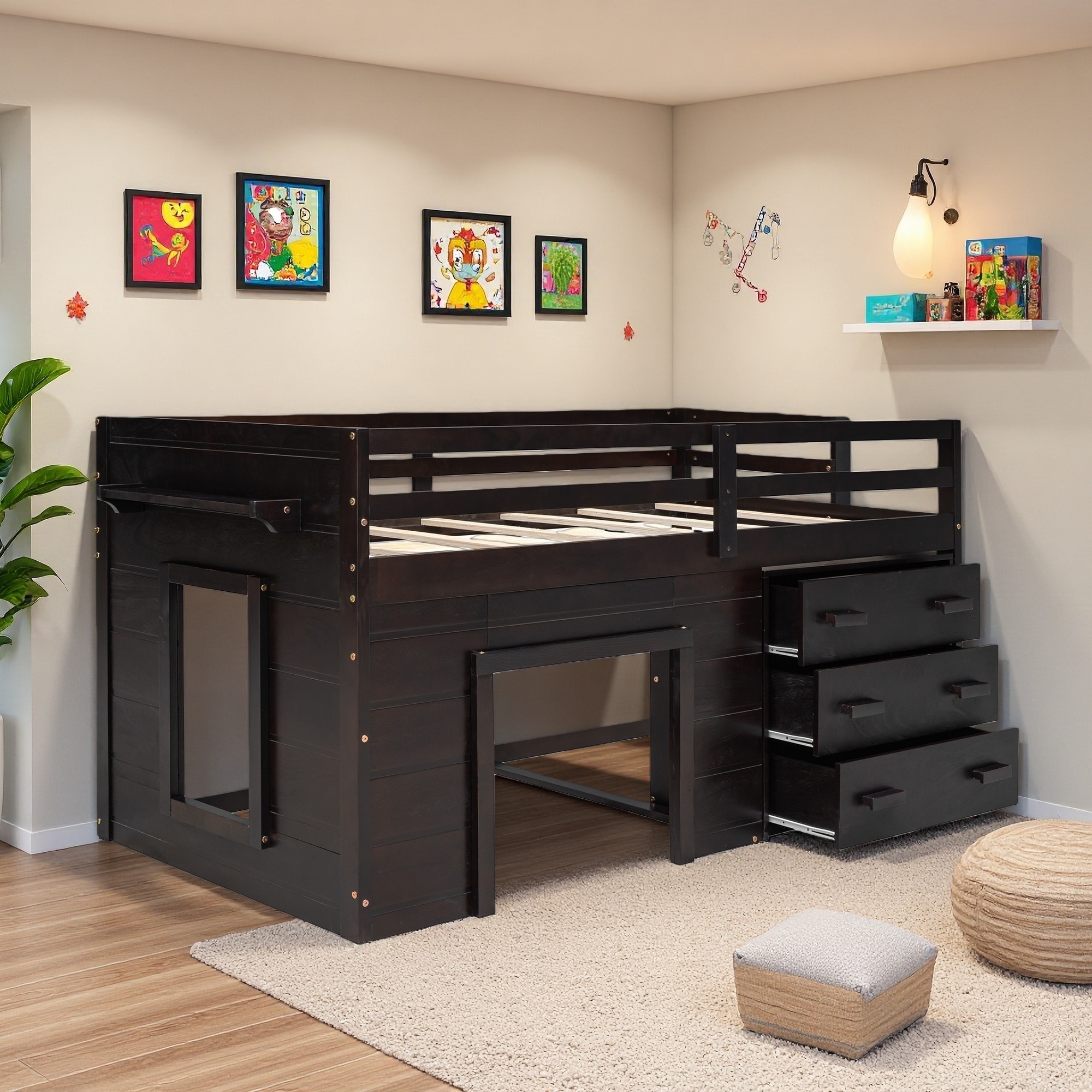 Solid Wood Full Size Low Loft Bed with Ladder and Slide