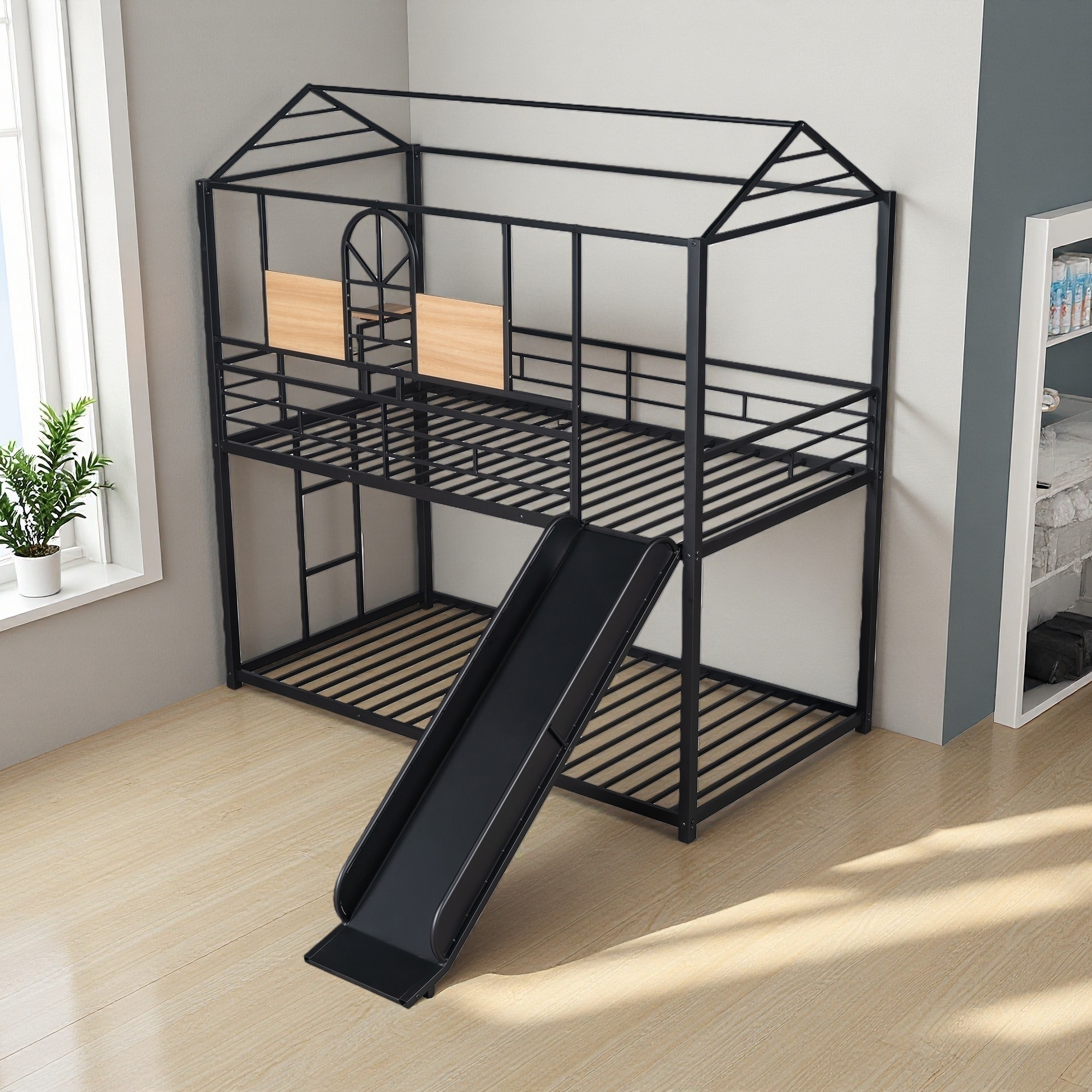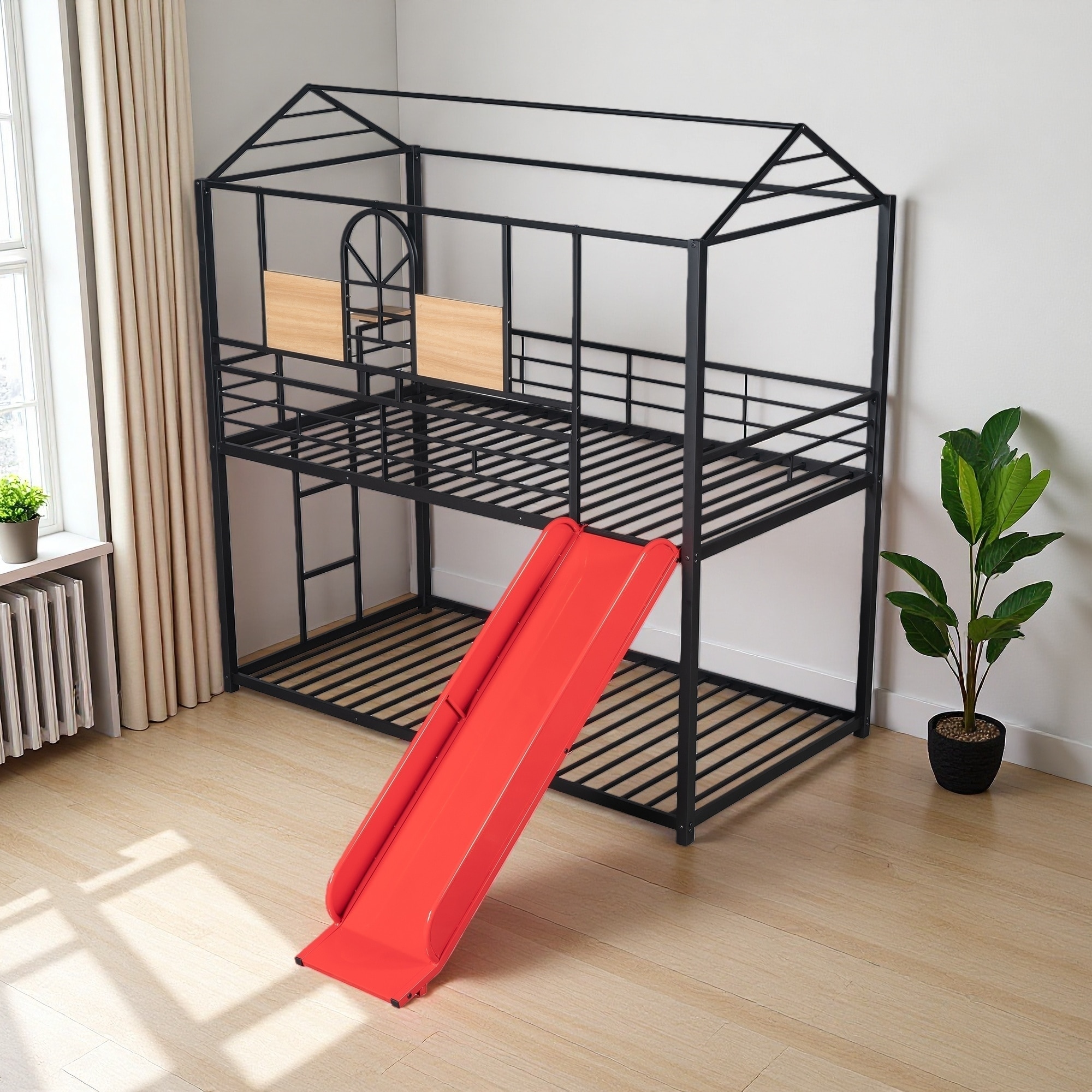 Twin Over Twin Metal House Bunk Bed with Slide and Side Shelf