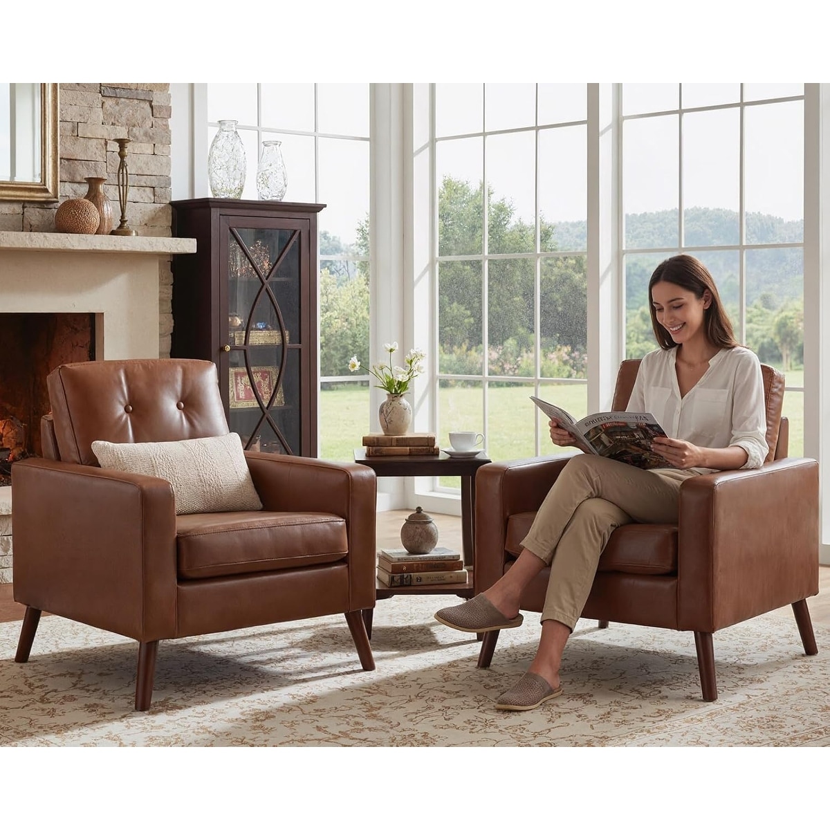 Set of 2 Mid Century Modern Armchairs, Faux Leather Upholstered Club Chairs with Rubber Wood Legs, 29.1D x 32.3W x 33.1H Inch