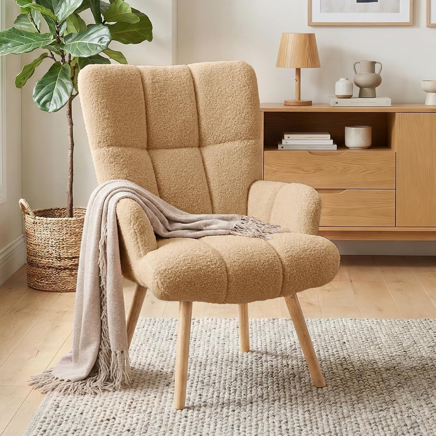Modern High Back Accent Chair with Wood Legs and Teddy Fleece Fabric for Living Room or Bedroom