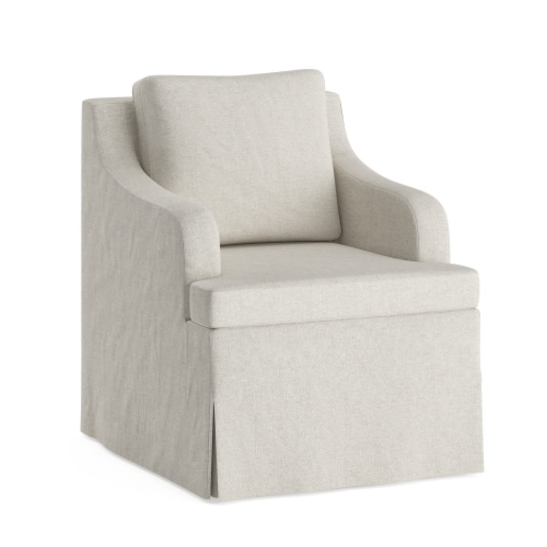 Swiveling modern upholstered leisure chair with solid wood armrests.