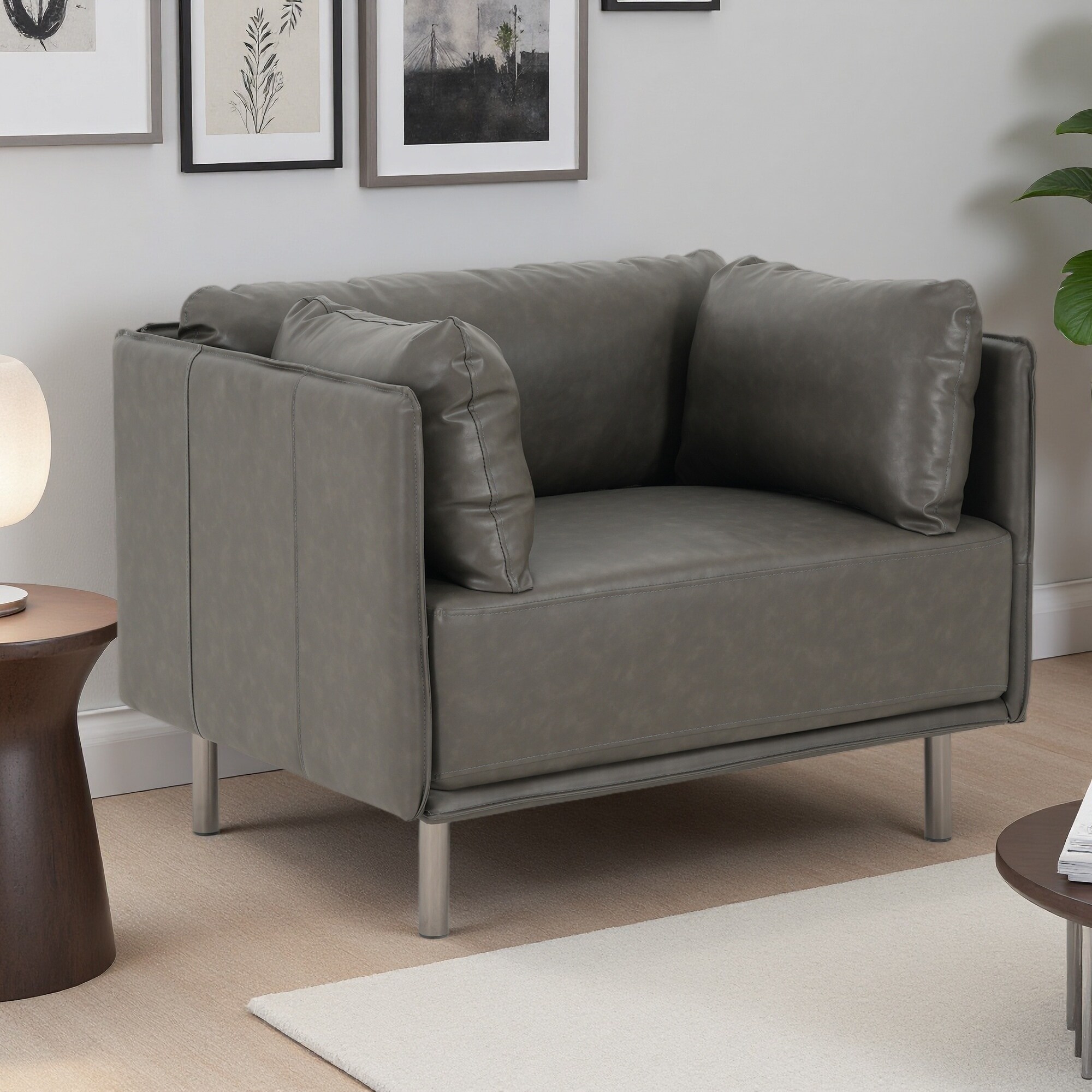 39" Vintage Lounge Chair with Wood Frame, Steel Legs & Wide Cushions