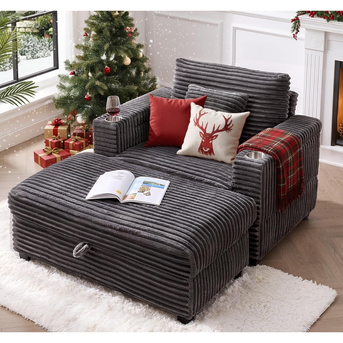 Oversized Corduroy Chair with Ottoman - 44-inch Wide, Cup Holders & USB Port, Grey