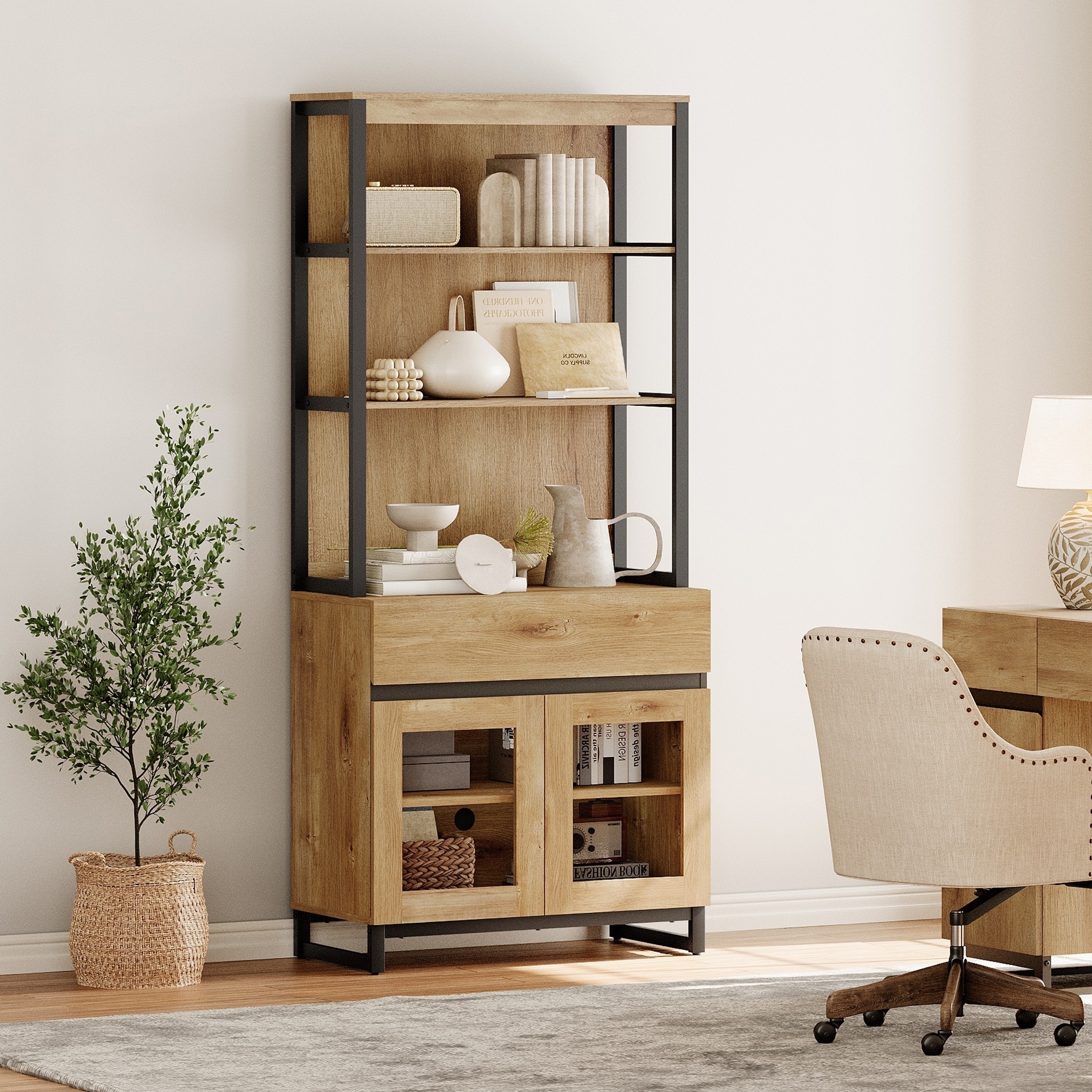 Modern 72" Tall Bookcase with Drawer and Open Book Shelfs for Home Office, Living room.
