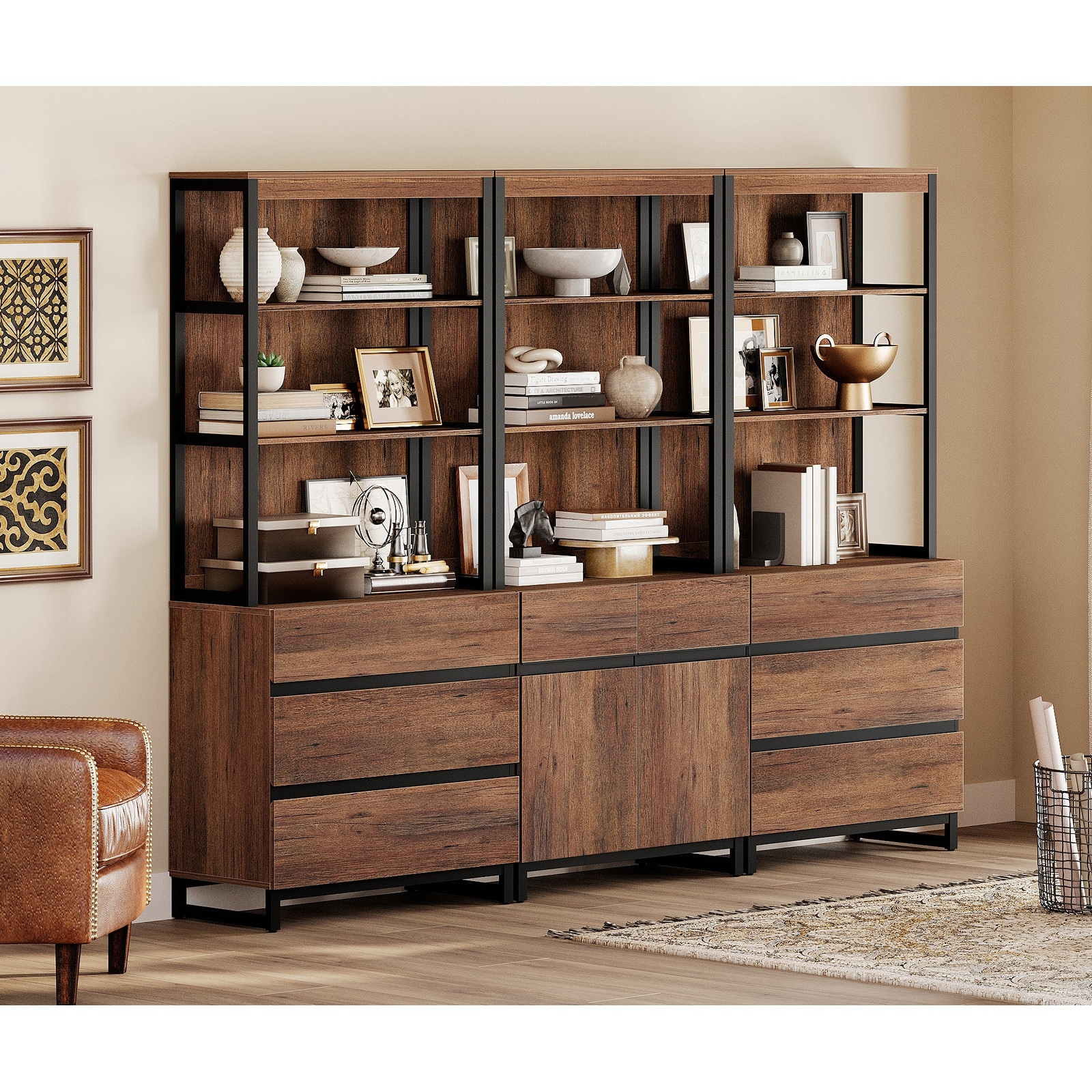 WAMPAT 3-Piece Modern 72" Tall Bookcase with 6 Drawers and Adjustable Shelves