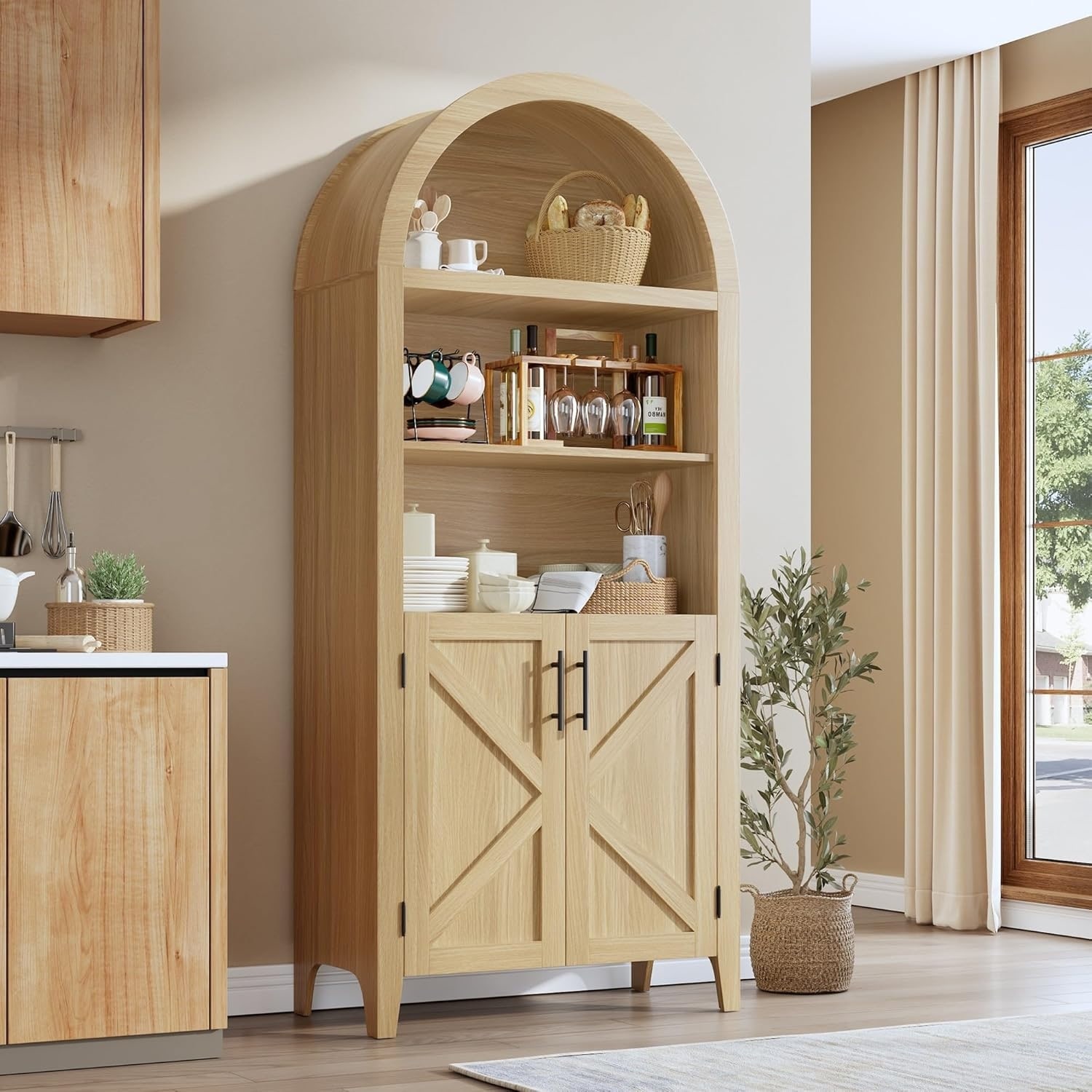 Tall Dome Bookcase with Drawers and Door, 4-Tier Wooden Bookshelf with Arched Top and Display Shelves