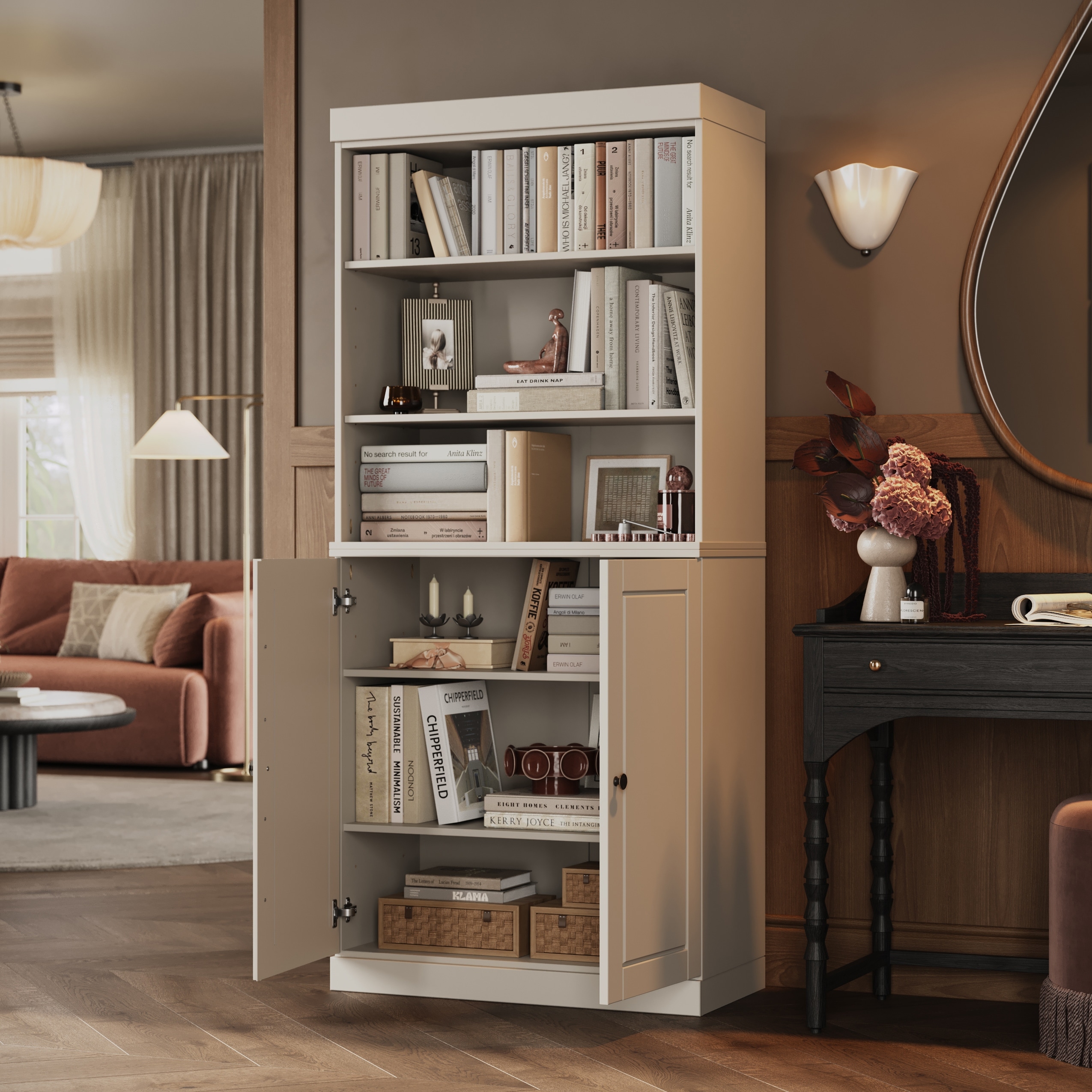 Solid Wood Tall Bookcase with Doors, Adjustable Shelves, Modular Storage, Open Display Bookshelf, 32" W x 71.5" H