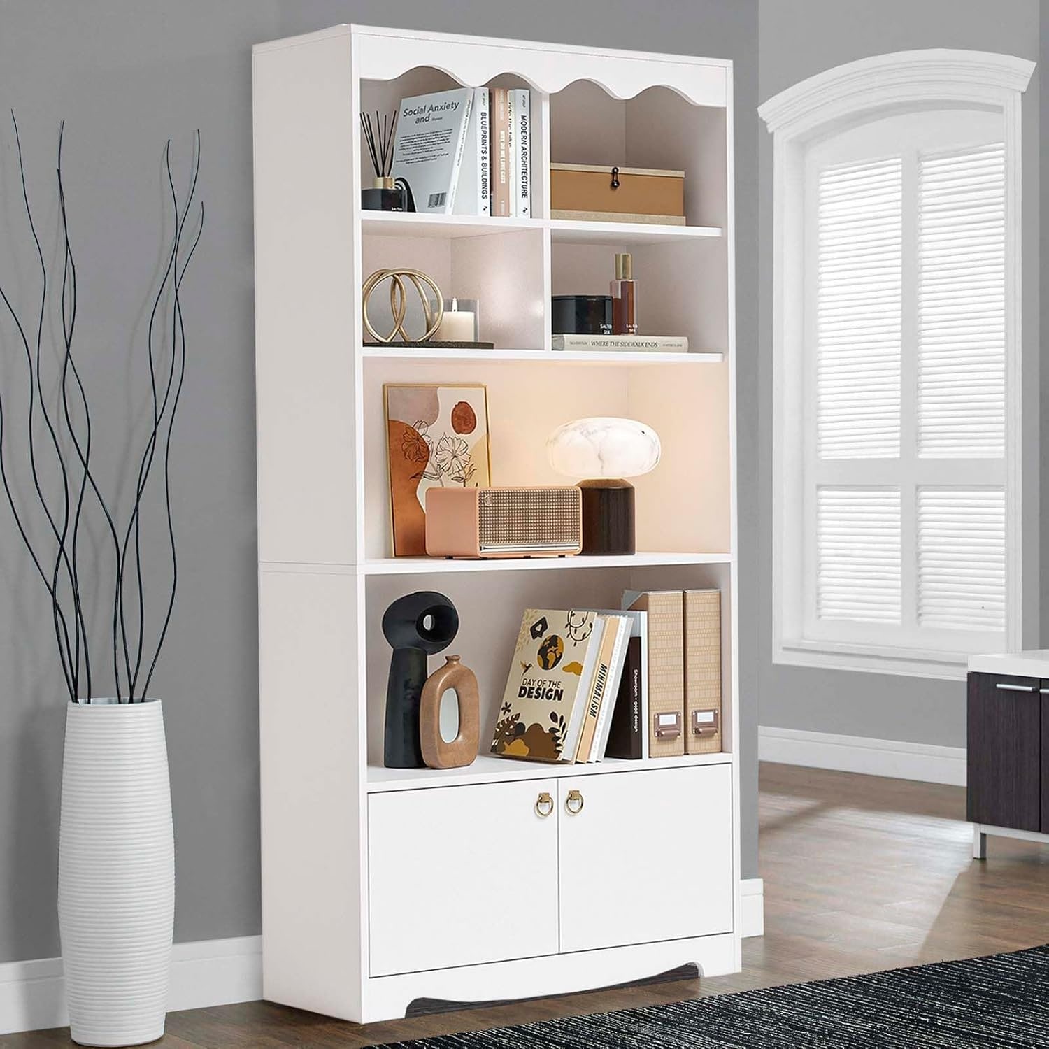 63" Modern White 5-Tier Bookcase w/ Doors & Cabinets