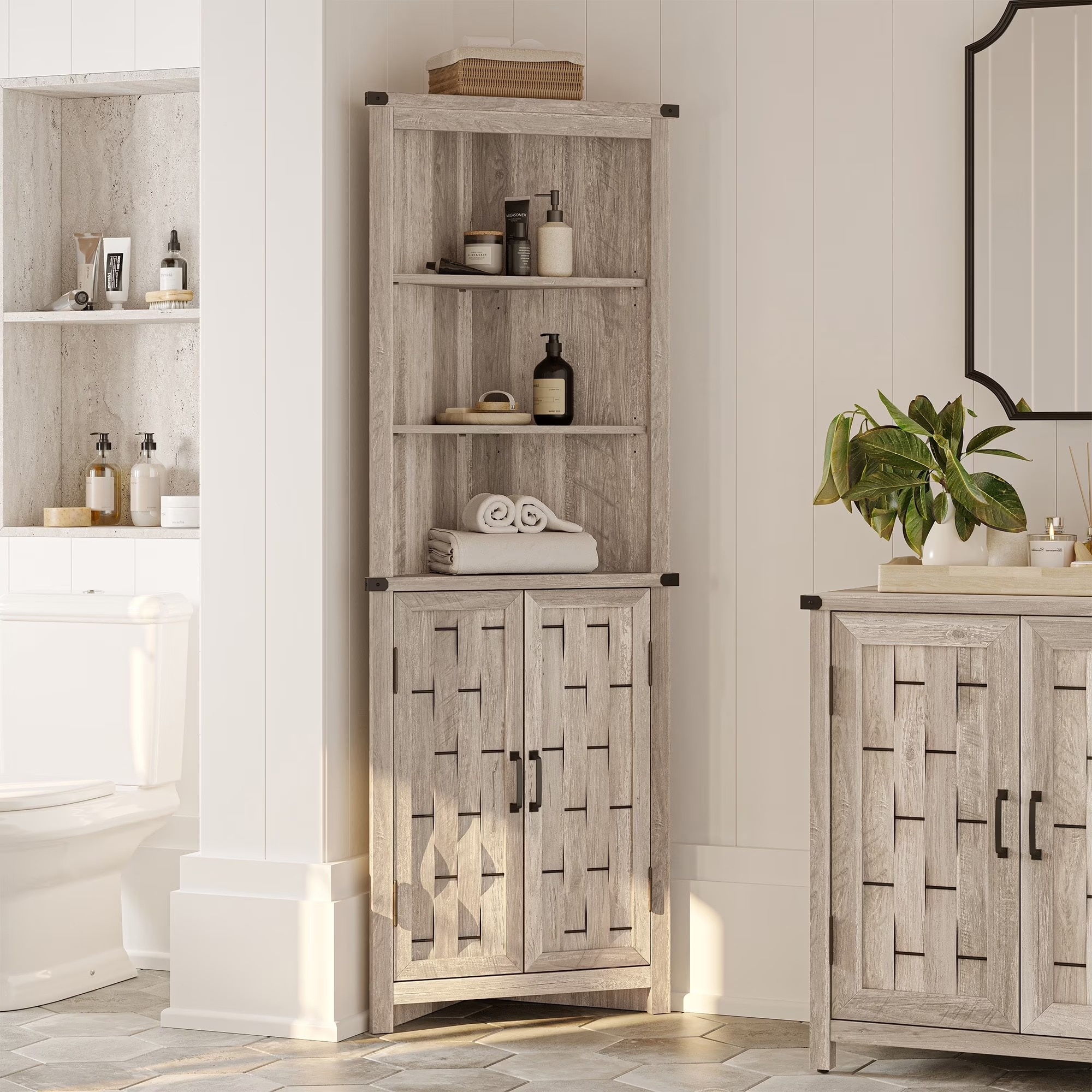 Tall Narrow Farmhouse Storage Cabinet with Door and Adjustable Shelves for Corner Light Brown