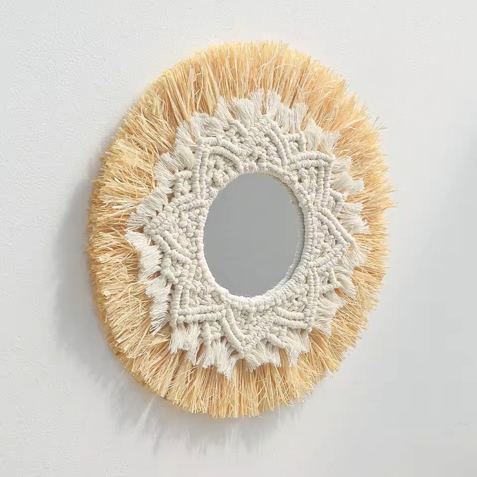 Macrame Hanging Wall Mirror Woven Boho Round Wall Mirror For Living Room & Bedroom Decor raffia Glass Mirror