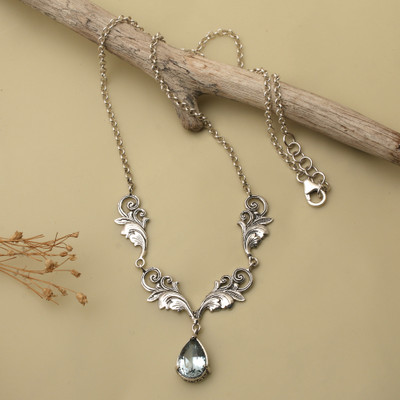 '6.5-Carat Blue Topaz Silver Pendant Necklace with Leaf Motif'
