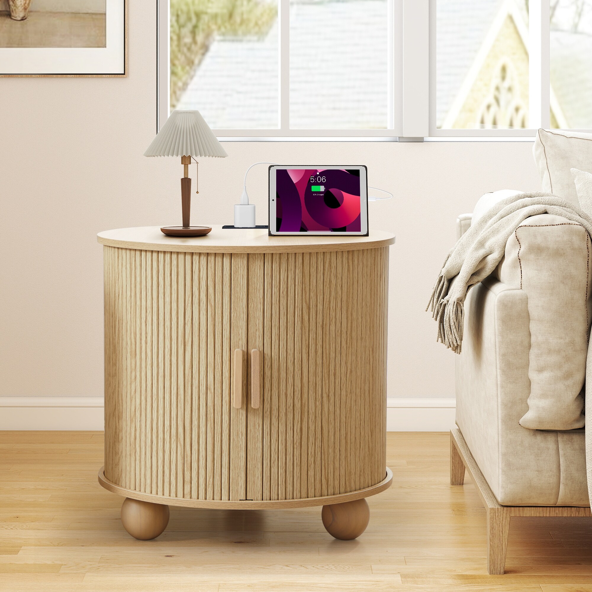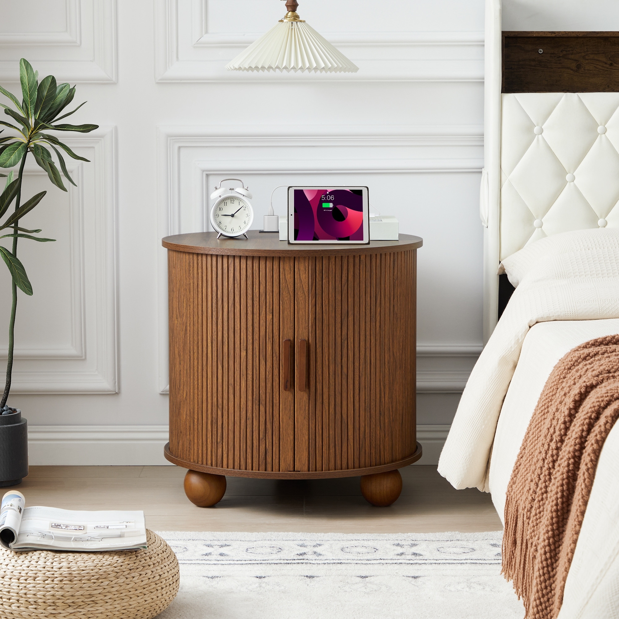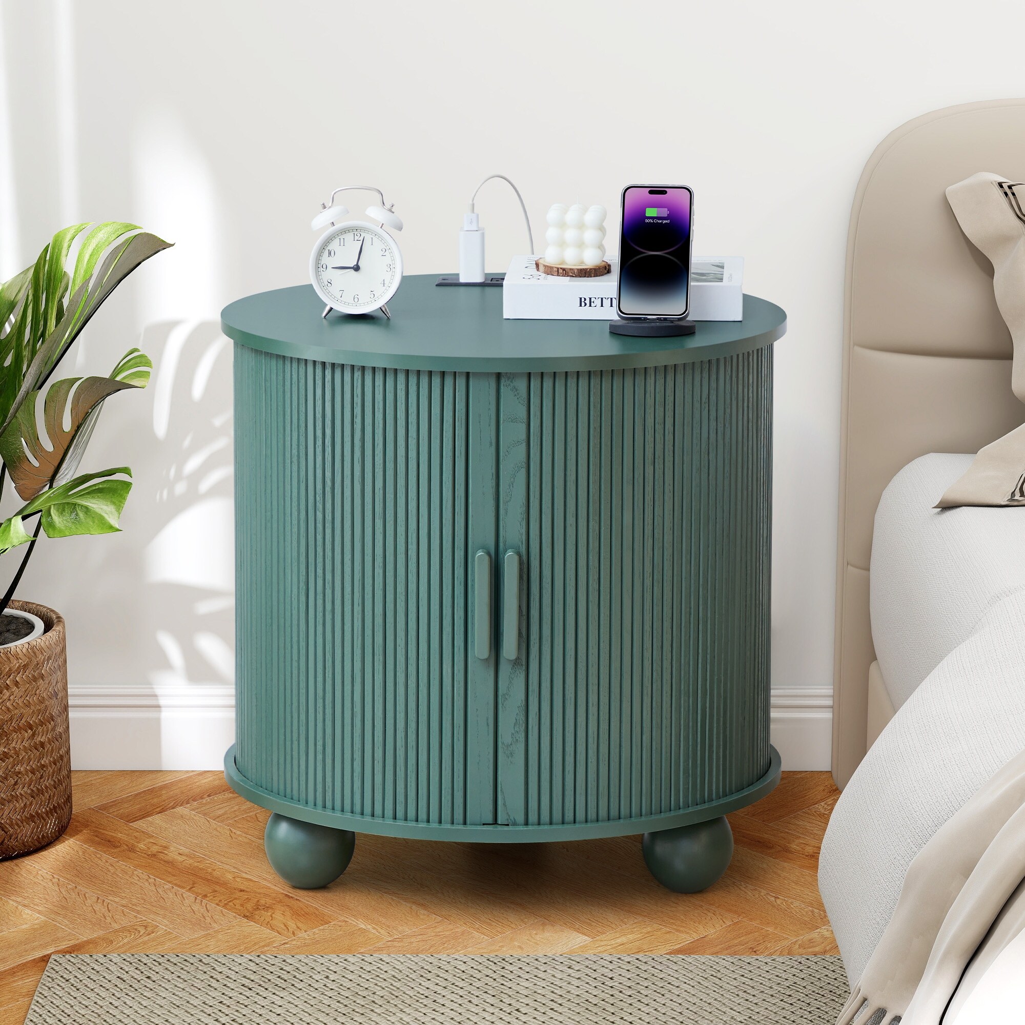 Round Sliding Storage Bedside Table with Power Strip